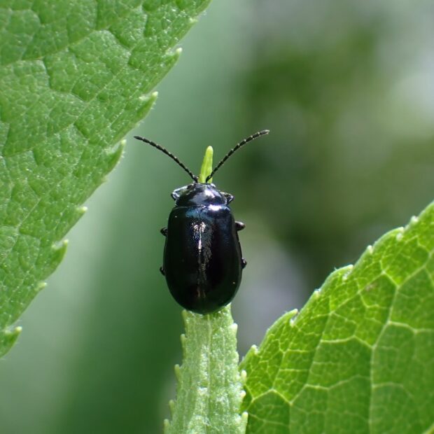 黒藍色のずんぐりしたハムシ