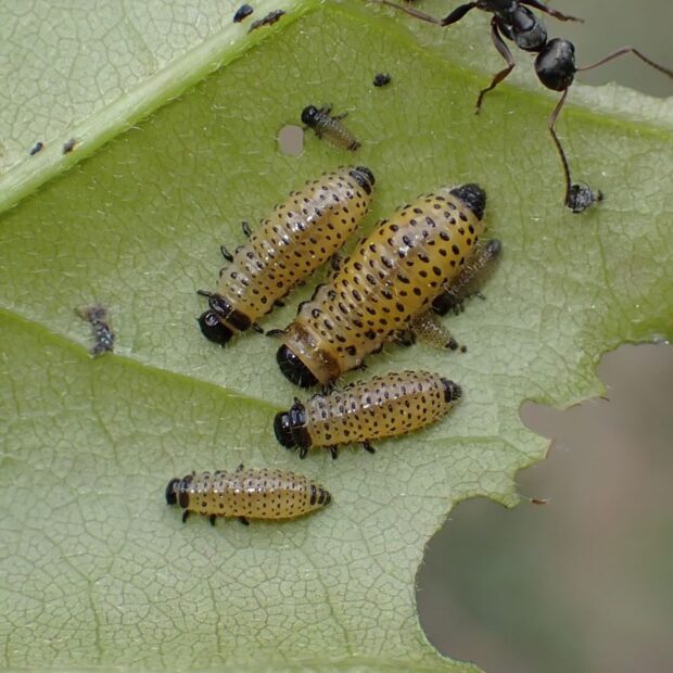 頭と胸は黒色で、 上翅は赤っぽいハムシ。 上翅が黒くなるのもおり、 変異が見られます。 成虫はフジの新芽が芽吹くとあらわれ、 葉を食べ始めます。