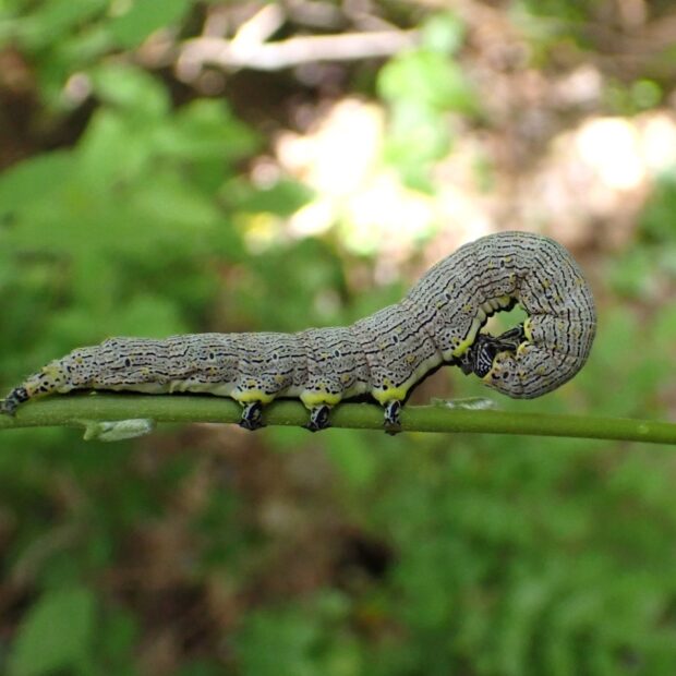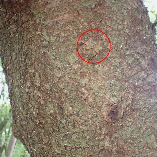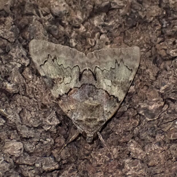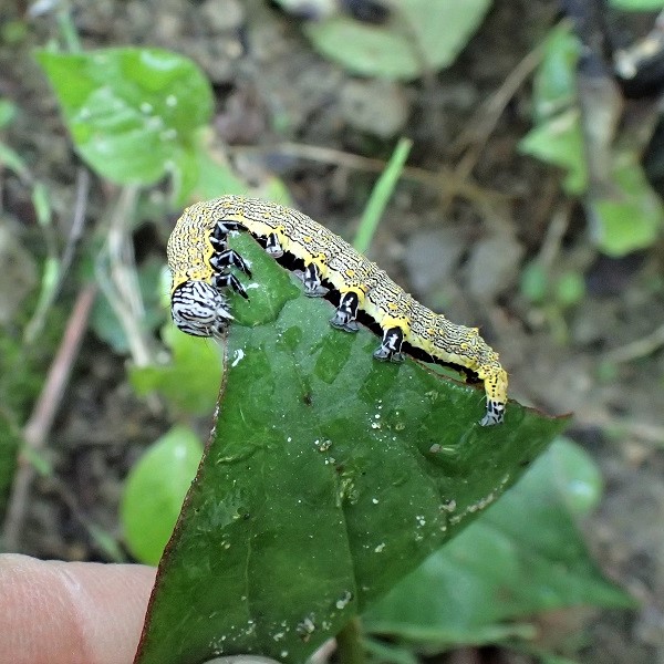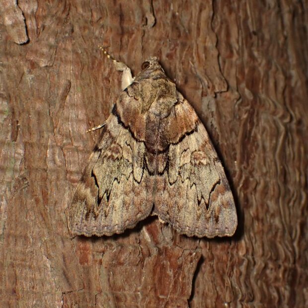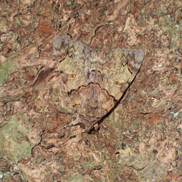夏、 樹液にやってくるシタバガの仲間。 前ばねは地味なまだら模様、 後ばねは派手な黄色と黒。 幹にとまっているときは木と一体となり目立ちませんが、 危険を感じるとパッと鮮やかな後ばねを見せます。