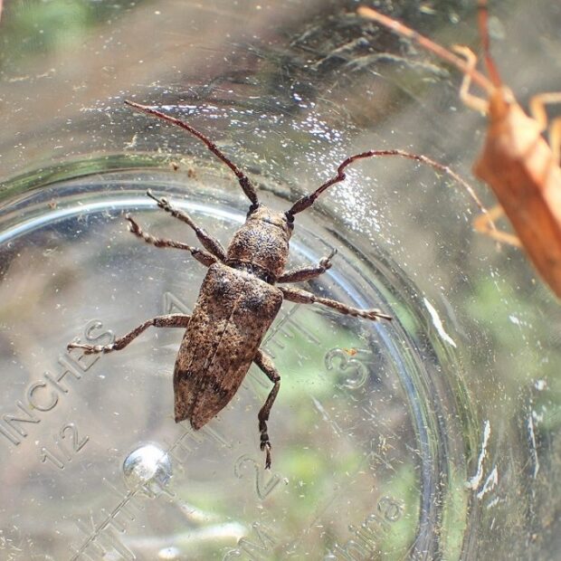 茶褐色で、 上翅(じょうし)の後ろの方に白と黒の帯があるサビカミキリの仲間。 平地~低山の雑木林などに生息し、 フジの枯れたツルで見られます。 とがっているはねの先端は、 少し開くのが特徴。 肩のあたりは黒い毛の束があり、 ふくらんでいます。