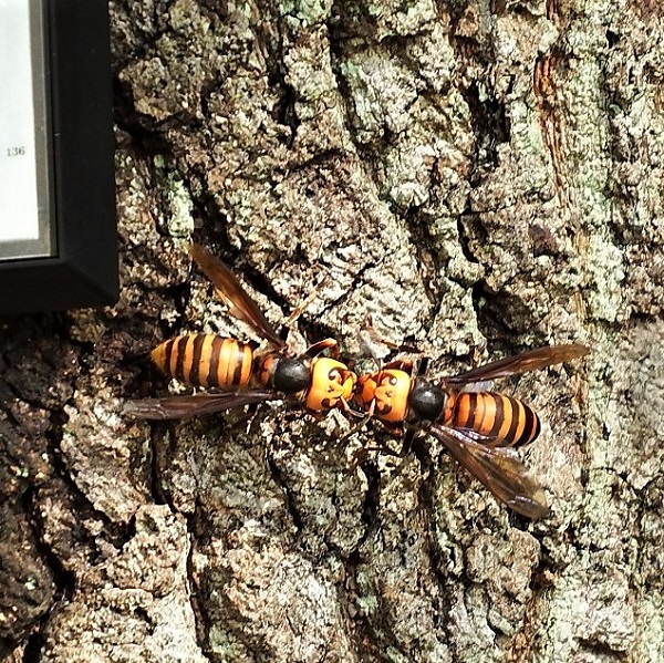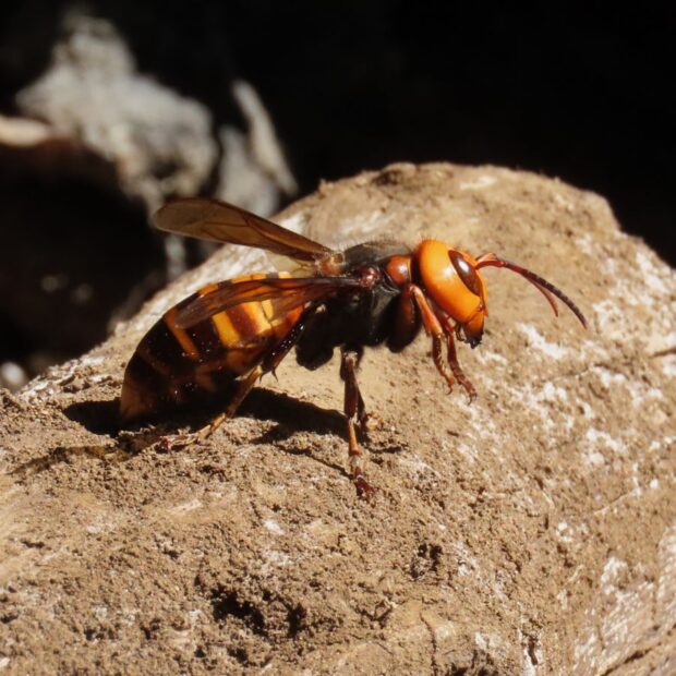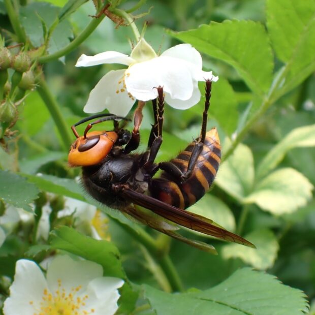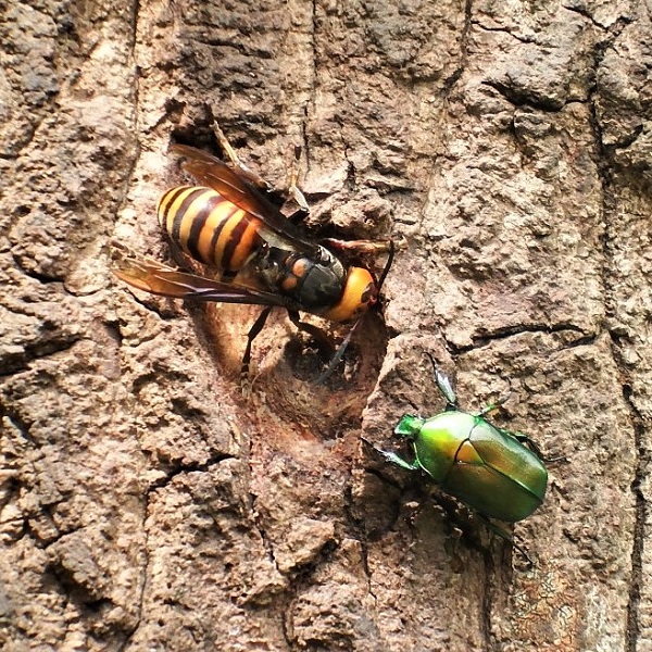 大型のスズメバチ。 越冬した女王バチは、 地中、 木の根元、 洞など閉鎖的な場所に、 5月頃から巣作りを始めます。 働きバチが羽化するのは6月頃で、 秋には大きな巣になります。 昆虫を捕らえて、 肉団子にして幼虫のエサにします。 ミツバチや他のスズメバチの巣を襲うこともあります。