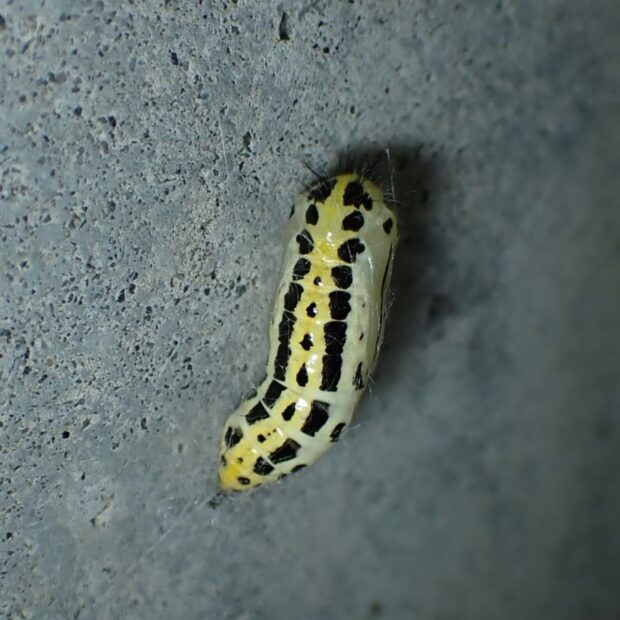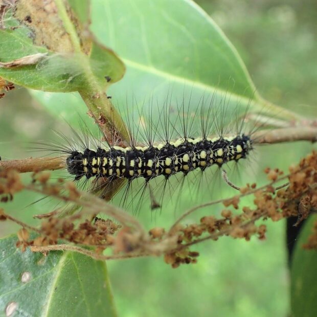 • 幼虫は、 黒地に黄色の模様で長い毛が生えている。 毒はない。
