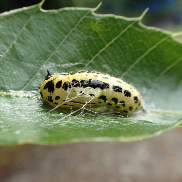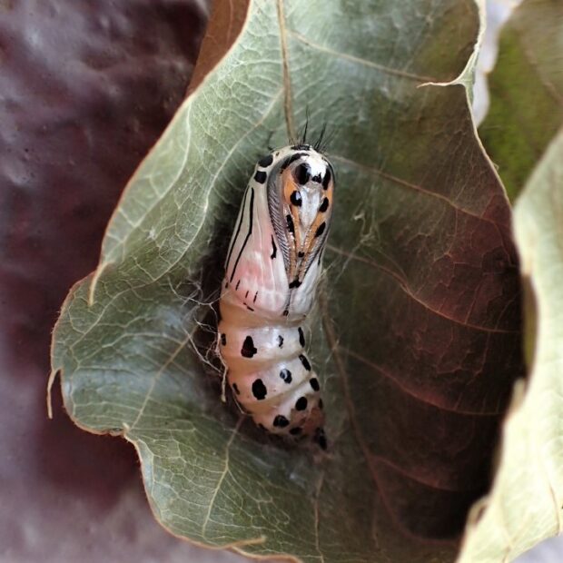 • 粗い糸で包まれた黄色と黒のきれいな蛹。