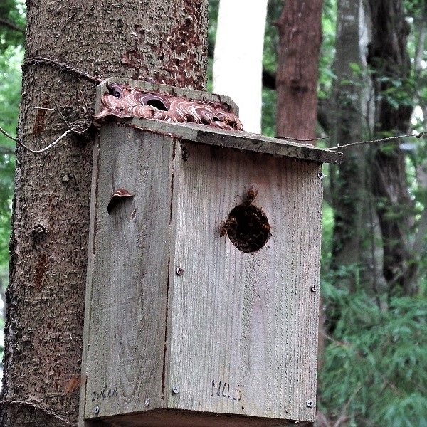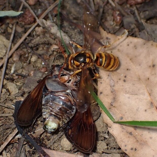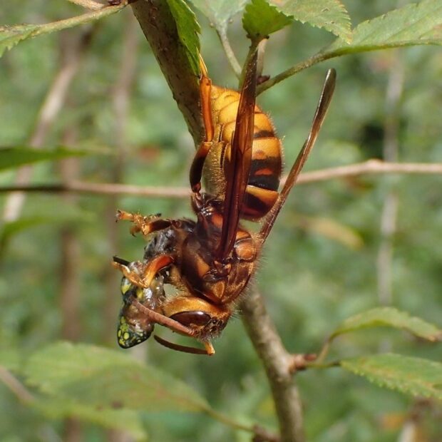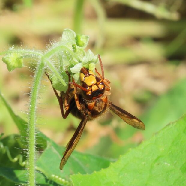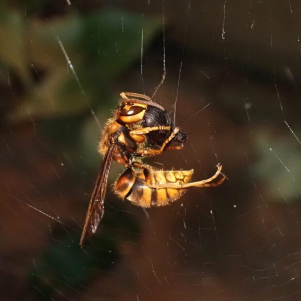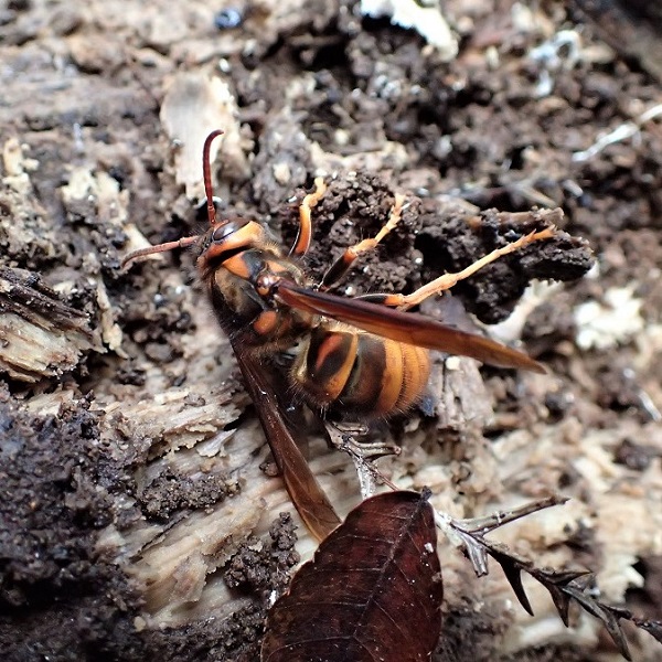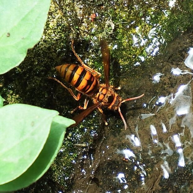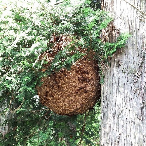 飛んでいるときは黄色一色に見えるスズメバチ。 木の枝、 屋根裏、 軒先、 橋の下などに巨大な巣を作ります。 巣は、 はじめは閉鎖的な空間に作られることが多いですが、 巣が大きくなってくると、 広い空間に引っ越しをして新しい巣を作ります。