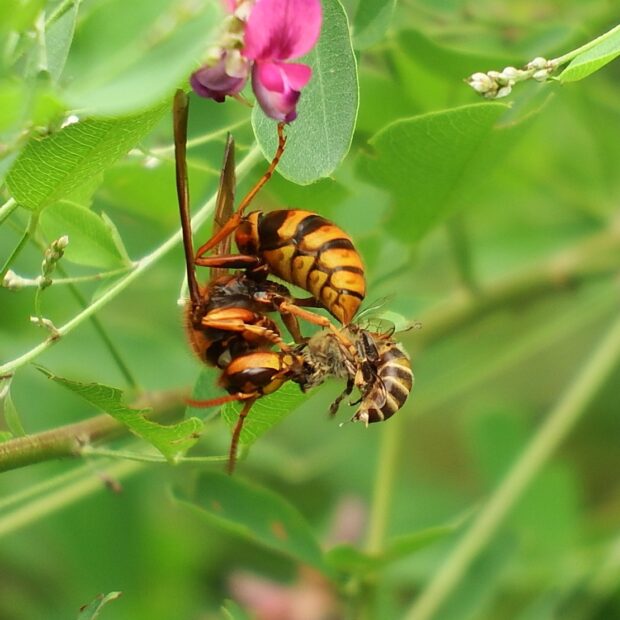 オオスズメバチに次いで攻撃的。 刺されると激痛が走り、 命にかかわることがあります。 8~10月はスズメバチの被害が多くなる季節ですので、 巣には近づかないよう特に注意してください。 黒いものに攻撃してくるので、 黒い服装は避けましょう。 ハチがカチカチといわせながら近づいてくると、 慌てないでその場からすぐに離れましょう。 ハチを手で払わないようにしてください。 万が一、 刺された場合は、 傷口を流水で洗い流し、 息苦しさなど様子がおかしい場合は、 一刻も早く病院で診察を受けてください。