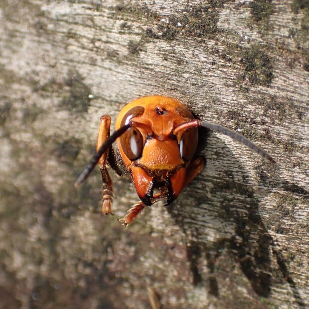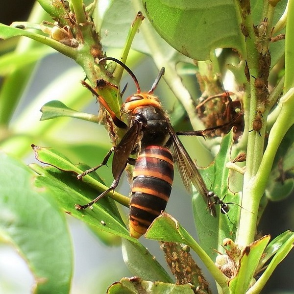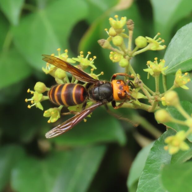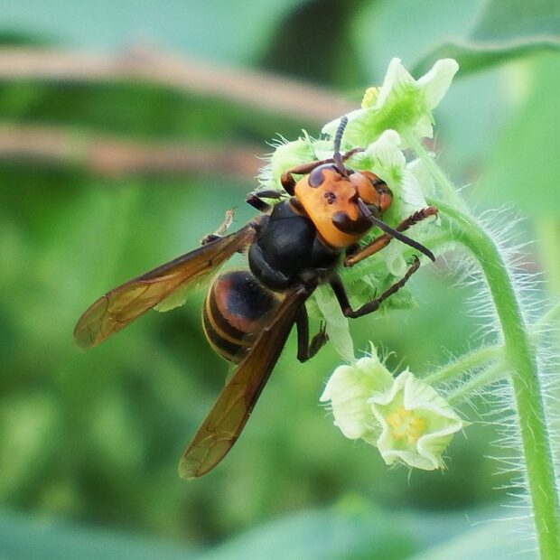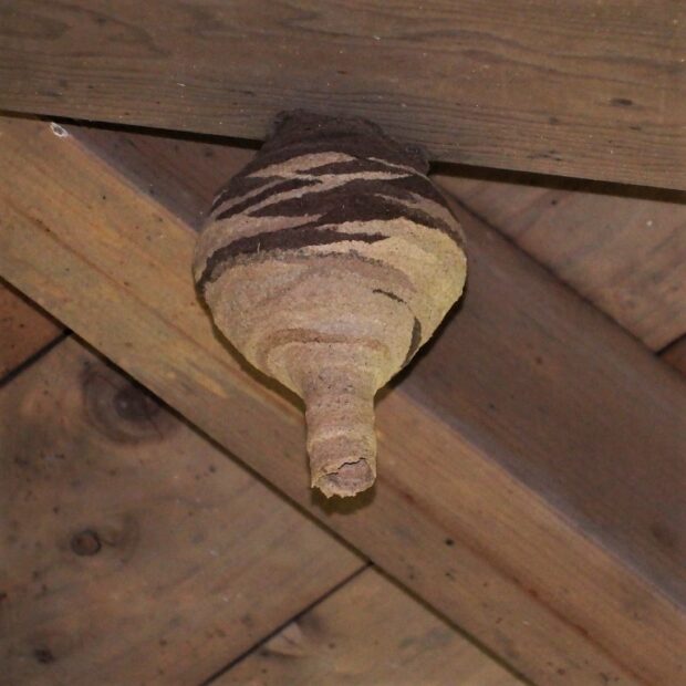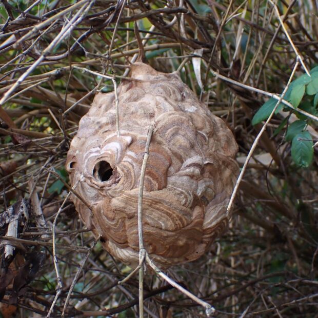 街中で見られるスズメバチ。 オオスズメバチと似ていますが、 体も頭も小さめです。 庭木の茂みや屋根のひさしなどに小さな巣を作ります。 巣は、 作り始めはとっくりを逆さまにしたような特徴のある形をしていますが、 働きバチが出てくる頃になると、 下の部分が取り払われて丸い巣になります。