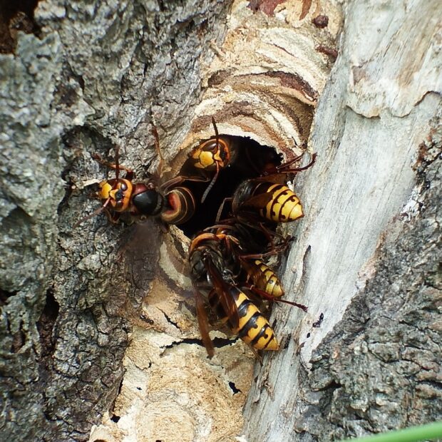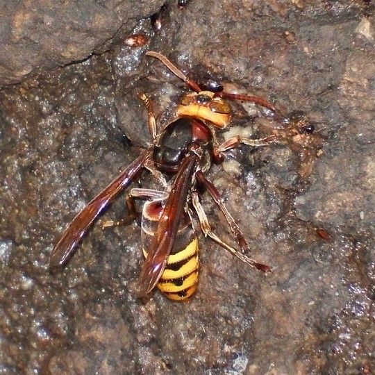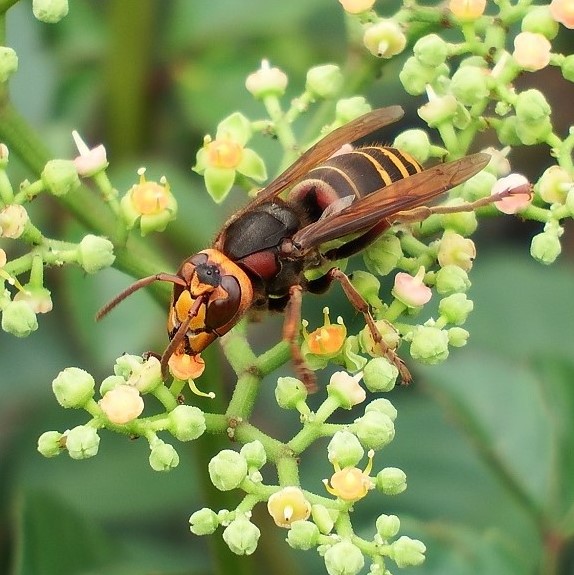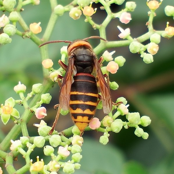 お腹の帯が波型になっているスズメバチ。 木のうろ、 地中などに巣を作りますが、 狭くなると、 広い場所に引っ越をして巣を作り直す性質があります。 いろいろな昆虫を捕らえ幼虫のエサにしますが、 特にセミを好むようです。