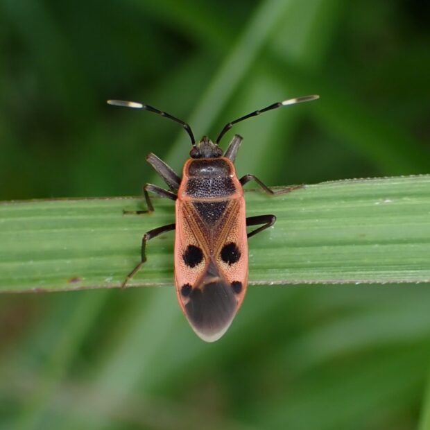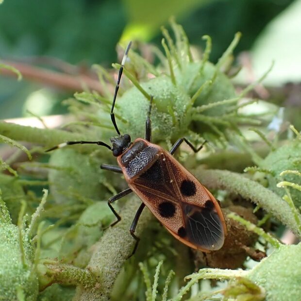赤褐色のはねに黒色の紋があるカメムシ。 アカメガシワの花や実によくやって来ます。 シイ、 クワ、 コウゾなどの花や実にも集まることがあります。