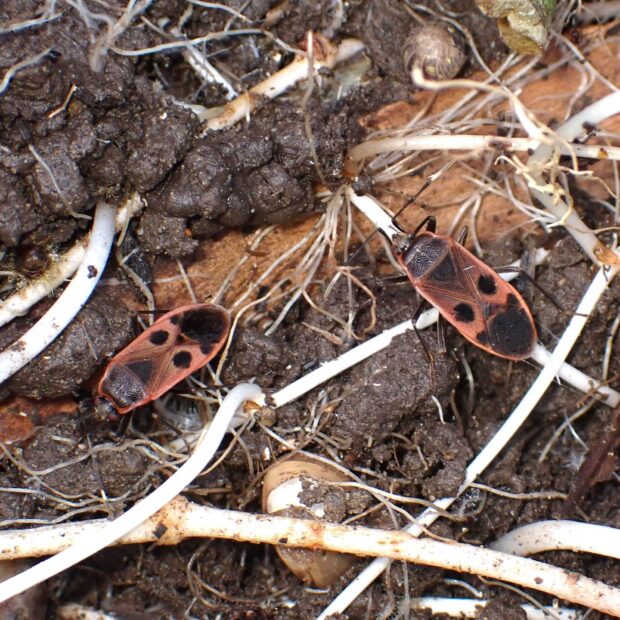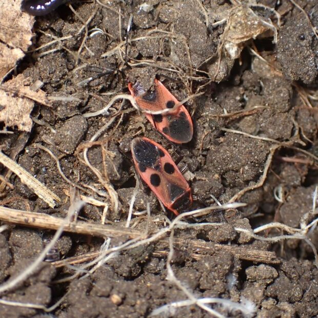 オオホシカメムシと似ていますが、 ヒメホシカメムシの方が小さく、 黒い紋の模様がちがいます。