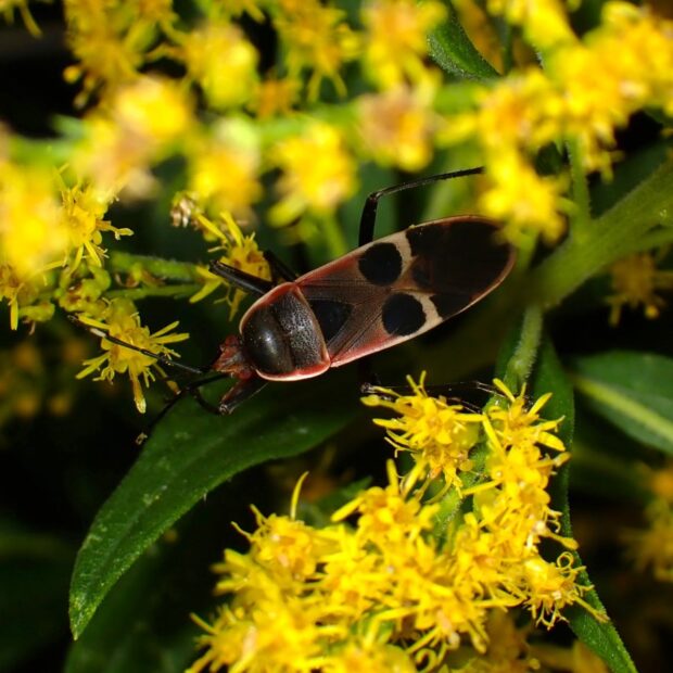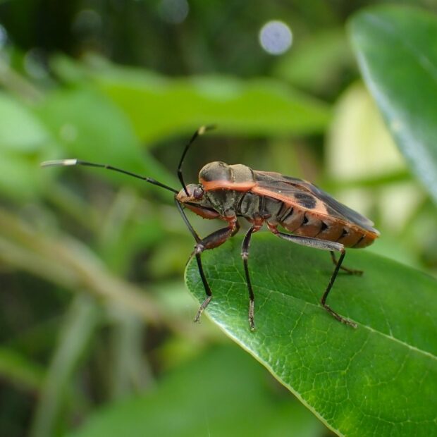 ヒメホシカメムシと似ていますが、 オオホシカメムシの方が大型で体が長いです。