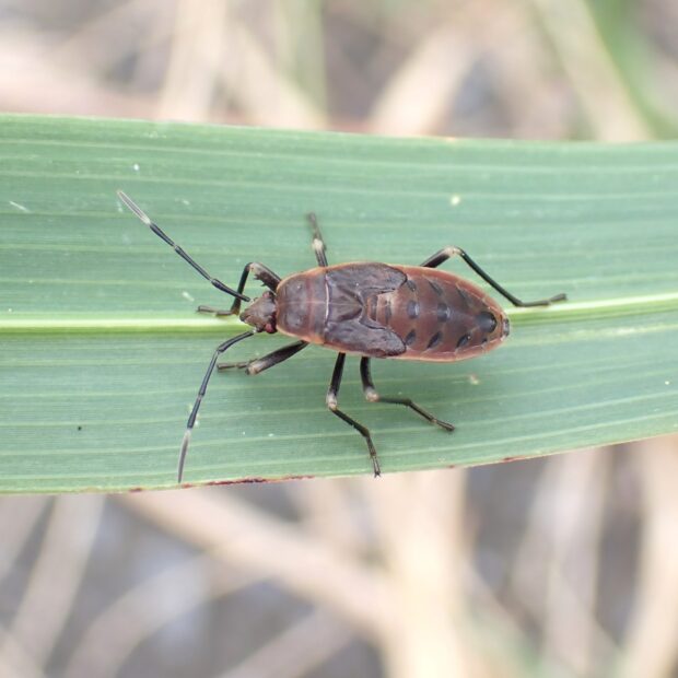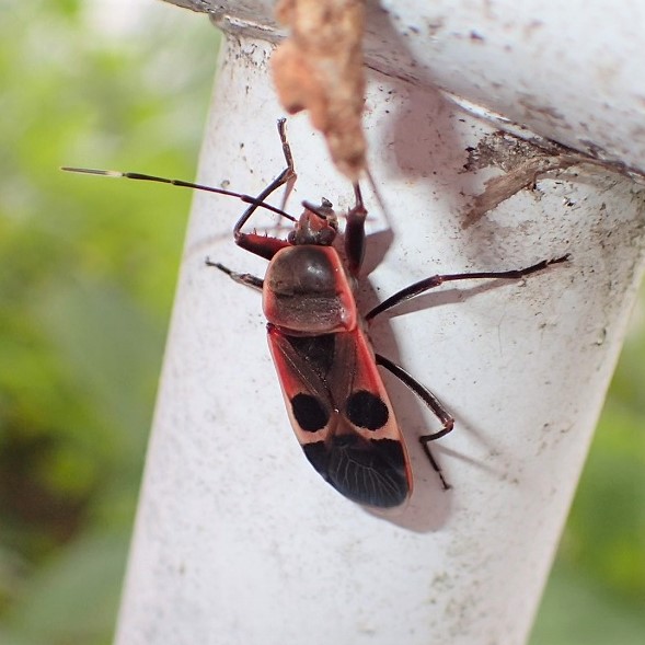赤褐色の大きな細長いカメムシで、 黒色の丸い紋が目立ちます。 アカメガシワの花や実によくやって来ます。 ミカンやモモを食べることもあります。