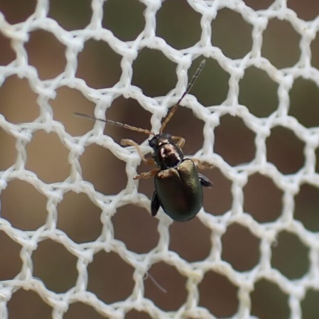 アカメガシワの葉で見られる緑色っぽい光沢があるノミハムシの仲間。 危険を感じるとピョンとはねて逃げます。
