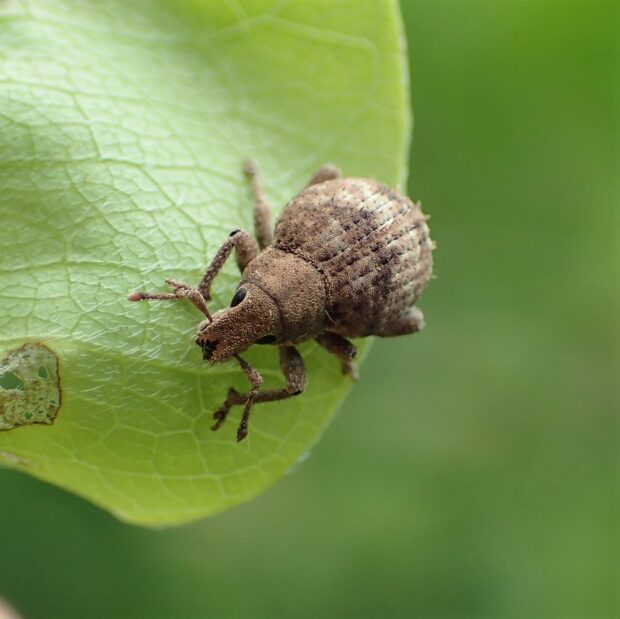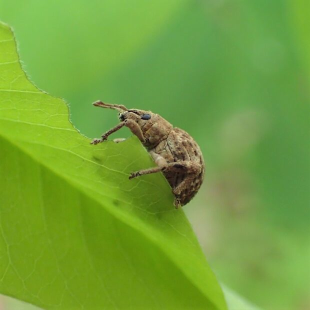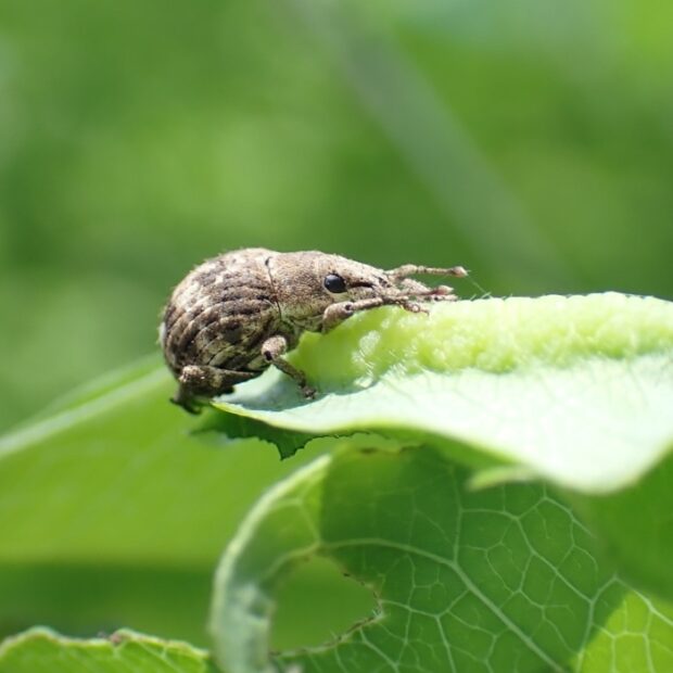 クチブトゾウムシの仲間で、 口吻(こうふん=細長く伸びた口の器官)はあまり長くありません。 「スグリ」の名前がついているように、 スグリの仲間の植物にやって来ますが、 ハギでもよく見かけます。