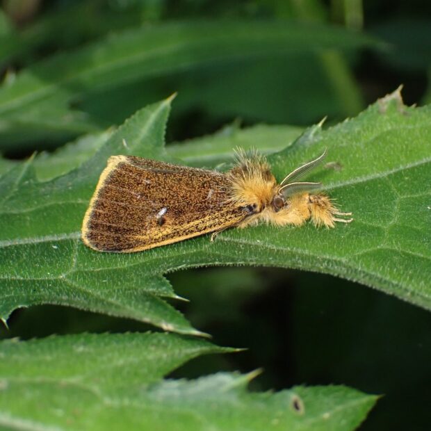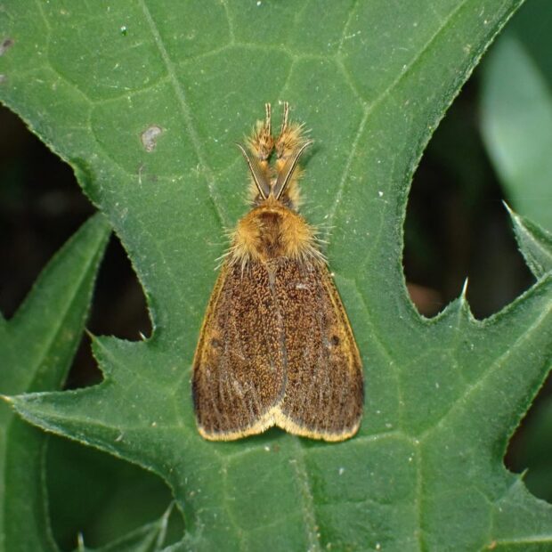 オスの体の色は変化がありさまざまです。 メスは黄色で、 前ばねの内側に黒い点がたくさん散りばめられています。 オスもメスも1対の黒点が目立ちます。 毛深い前あしを前に伸ばしてとまります。