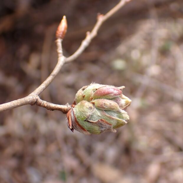 イヌシデの冬芽が大きくふくらんだ虫こぶ。 ソロメフクレダニが作ったもので、 表面は長い毛が密に生えています。 5月にダニが脱出します。