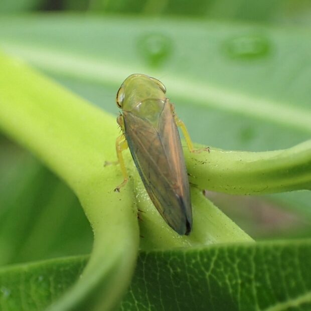 平べったい大きな頭のヨコバイ。 体の色は黄緑色、 はねは明るい茶色、 複眼には黒い横線がはいっています。 ちょっと悪そうで、 ユニークな顔をしています。 南方系のヨコバイで、 関東地方では少ないです。