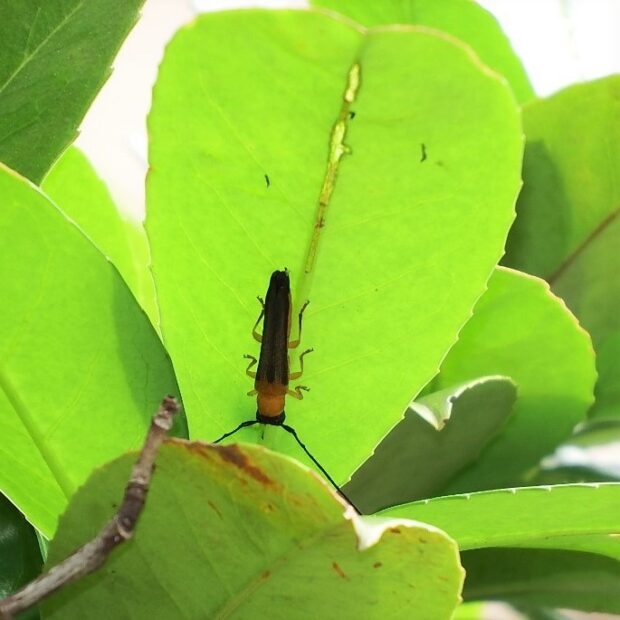 頭が黒、 胸が鮮やかなオレンジ色のカミキリムシ。 市街地の公園のサクラなどで、 普通に見られます。 成虫は、 葉の裏から葉脈をすじ状にかじって食べます。 メスは生木の細い枝に産卵します。 幼虫は材を食べて成長し、 成熟すると枝先を斜めに切断し、 切断面に木屑を詰めて越冬します。