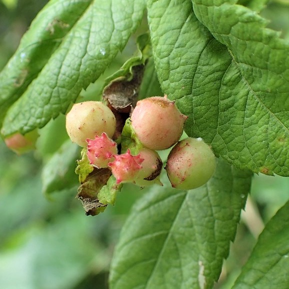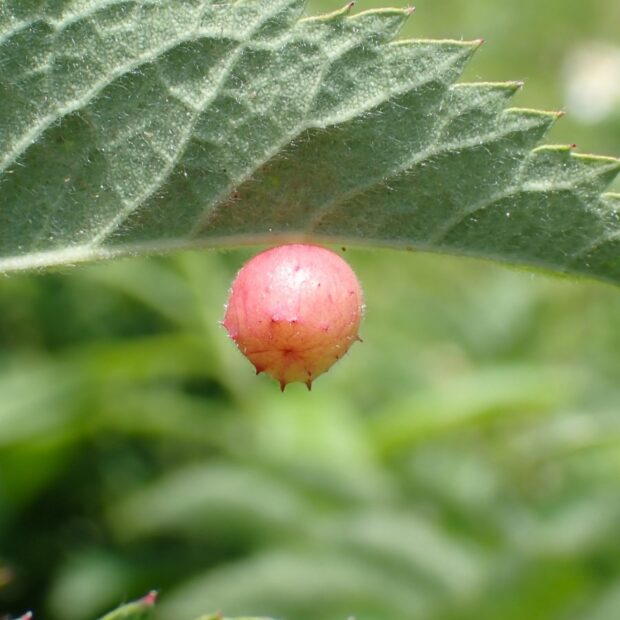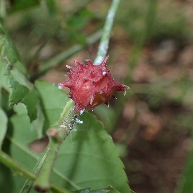 バラハタマバチという小さなハチが、 バラの葉や若い実に作った虫こぶ。 黄白色や赤色の丸い虫こぶで突起があります。 虫こぶは6~7月に葉から落ち、 虫こぶ内で幼虫で越冬し、 春に成虫が出てきます。