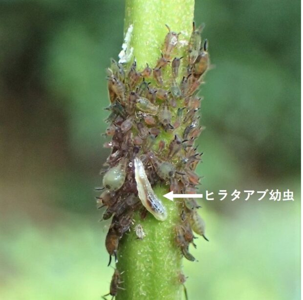 マテバシイの枝にびっしりつき、 アリと共生するケクダアブラムシ。 ケクダアブラムシは、 樹木のみで見られ、 角状管(かくじょうかん=お腹の先端から出ている2本のツノのような器官)が長く太いのが特徴です。 (MT)
