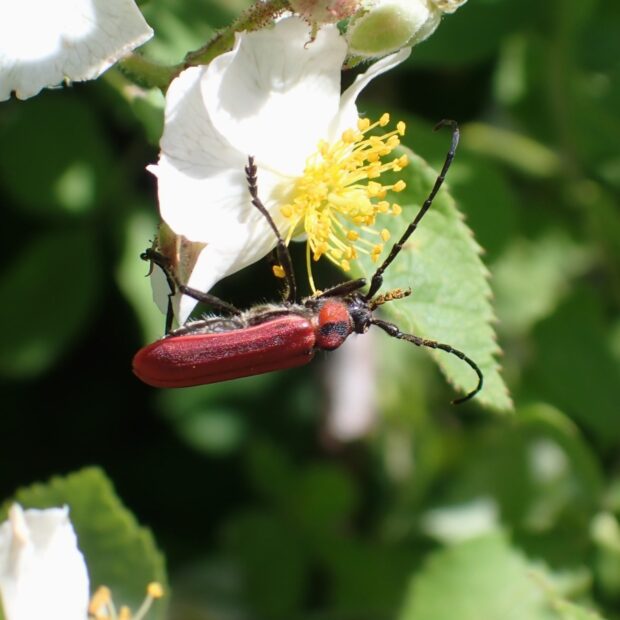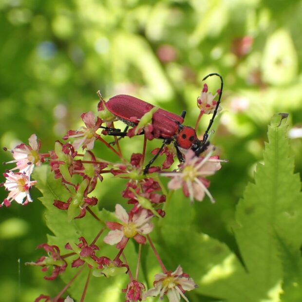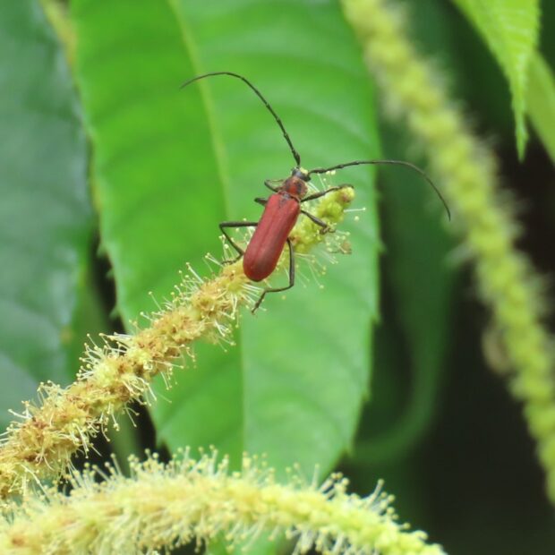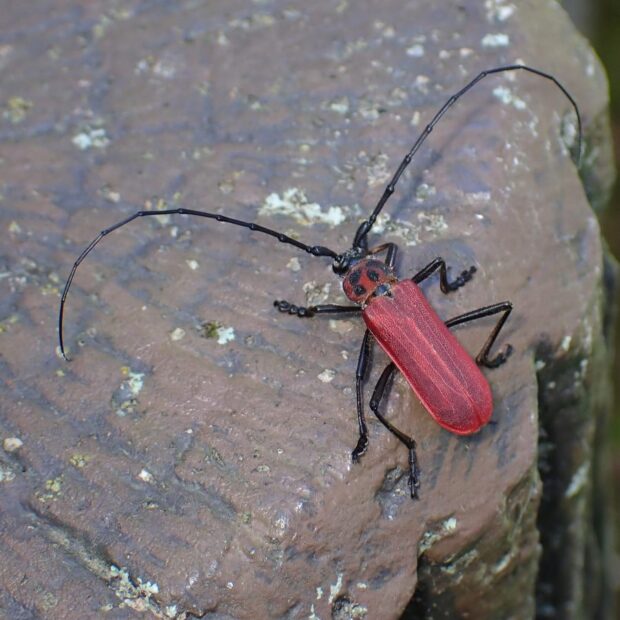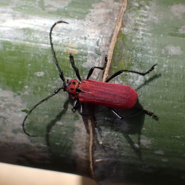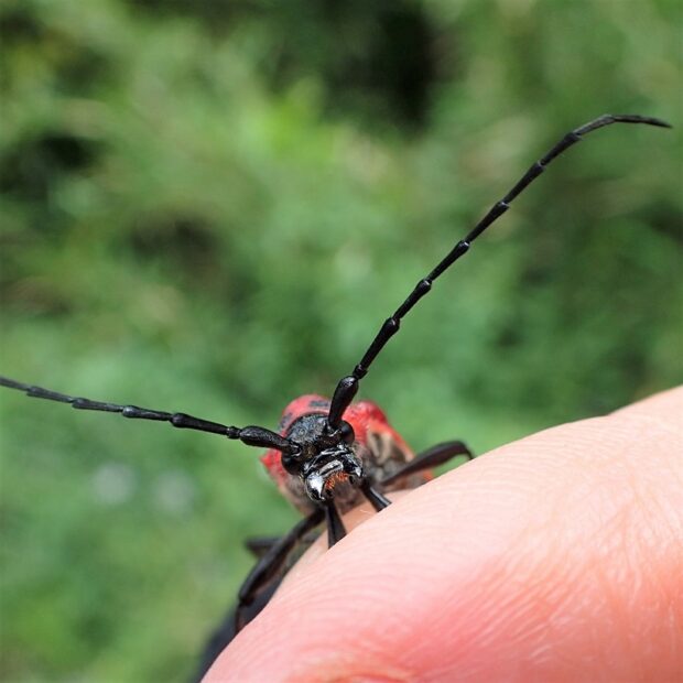 前胸に黒い紋がある、 赤いカミキリムシ。 クリ、 ネギ、 ハゼノキなどいろいろな花を訪れ、 竹林などで普通に見られます。 成虫をつかむと、 刺激臭がします。 メスは弱ったタケや伐採されたタケに産卵し、 幼虫はタケを食べて育ちます。