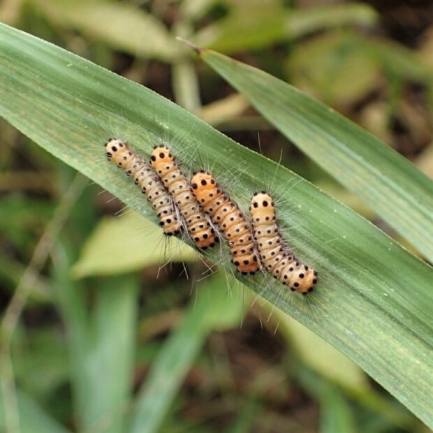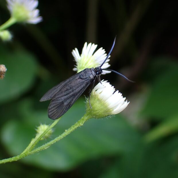 ササやタケを食べて育つ黒い小さなガ。 マダラガの一種で、 民家の庭、 公園、 林縁などで普通に見られます。 若い幼虫は集団で葉を食べ、 成長すると分散し、 ゾロゾロ壁などを歩き繭をつくります。