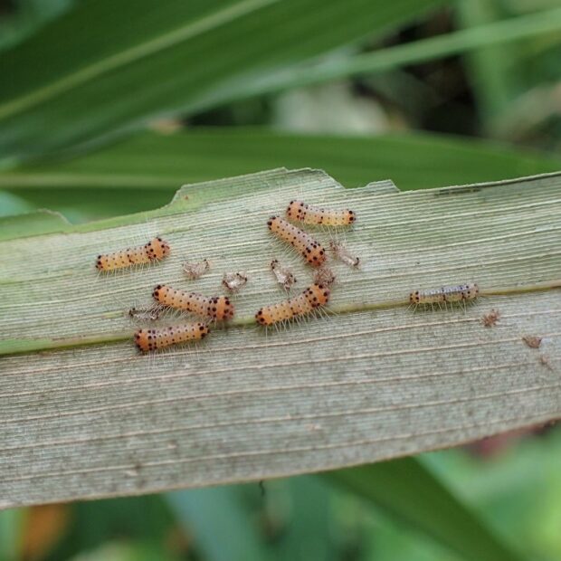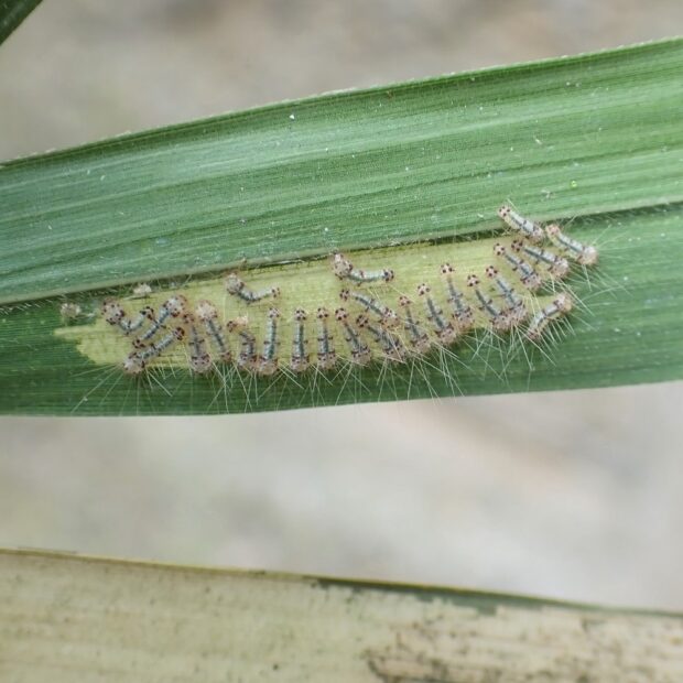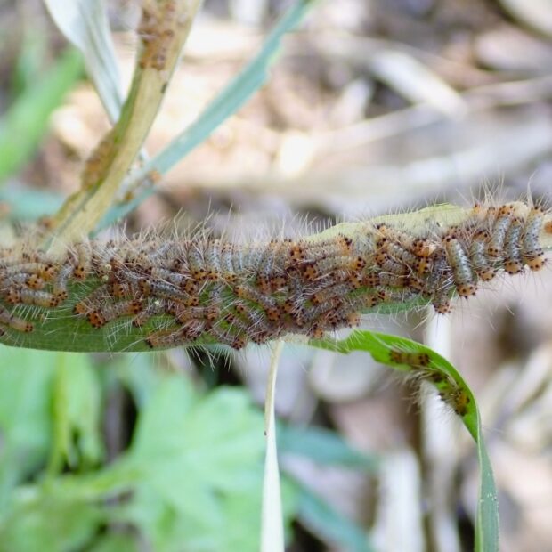 幼虫は毒の毛があり、 触れると痛みを感じ、 赤くはれ、 やがて強いかゆみに襲われます。 葉の裏に幼虫が隠れていることがありますので、 気をつけてください。 葉が枯れたように白くなっていると要注意です。 刺された場合は、 粘着テープで毛を取り除き、 流水で洗い流してください。