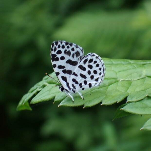 はねの裏の黒点が、 碁石(ごいし)のように見えることから、 ゴイシシジミと名づけられました。 やや暗い環境を好み、 午後から夕方にかけて活発に飛びます。 幼虫はササやタケ類についているアブラムシを食べる肉食性。