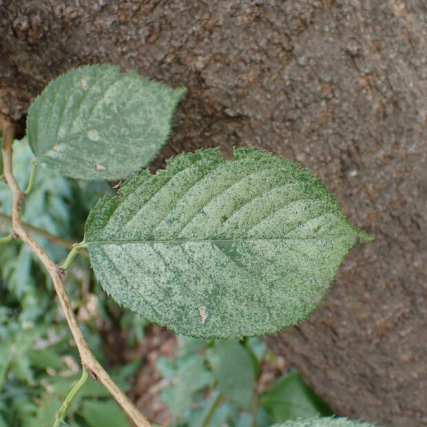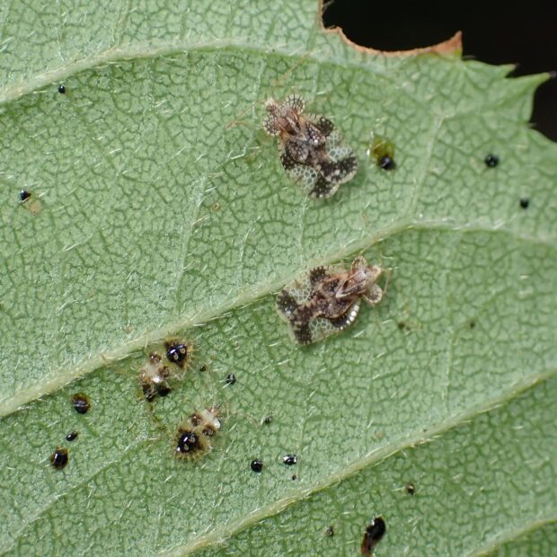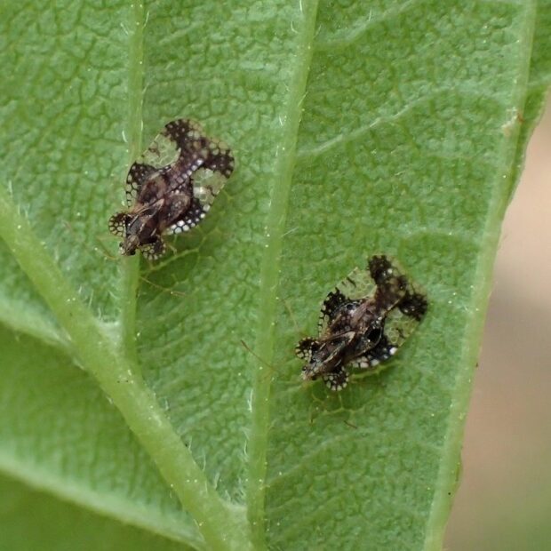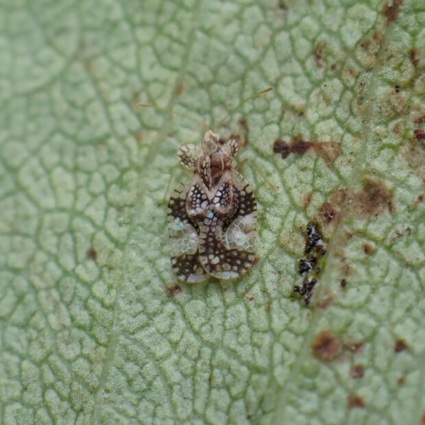 バラ科の植物に集まるグンバイムシ。 グンバイムシは葉の汁を吸うカメムシの仲間で、 相撲の行司が持っている軍配に形が似ていることから、 グンバイムシと名づけられました。 グンバイムシがいると葉は白くなります。