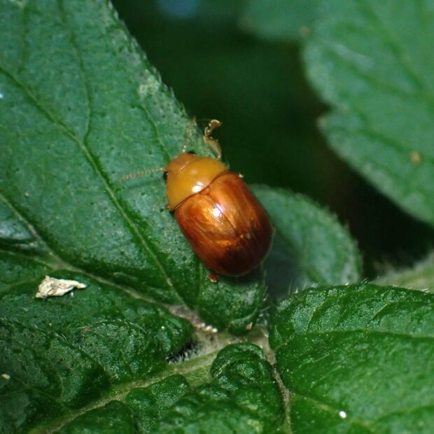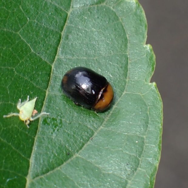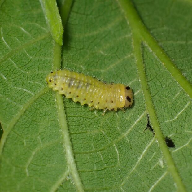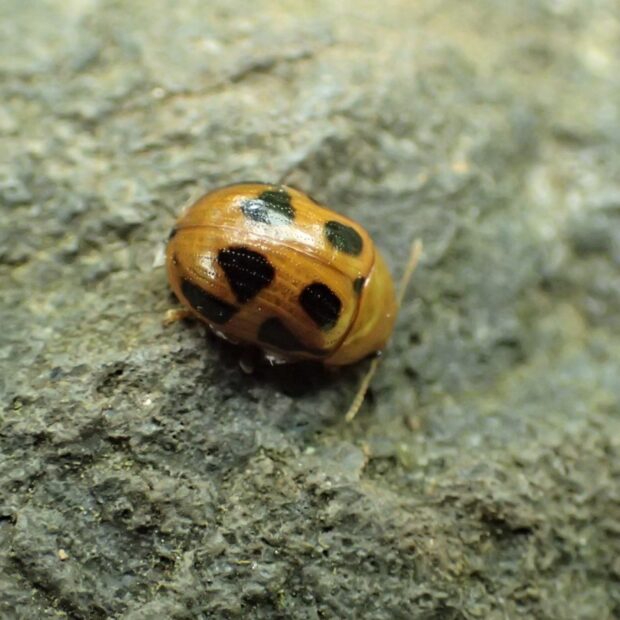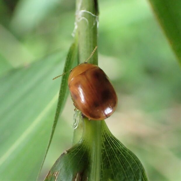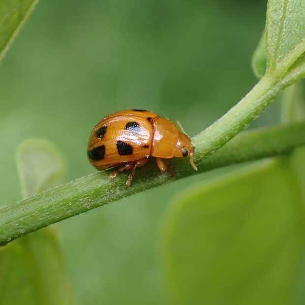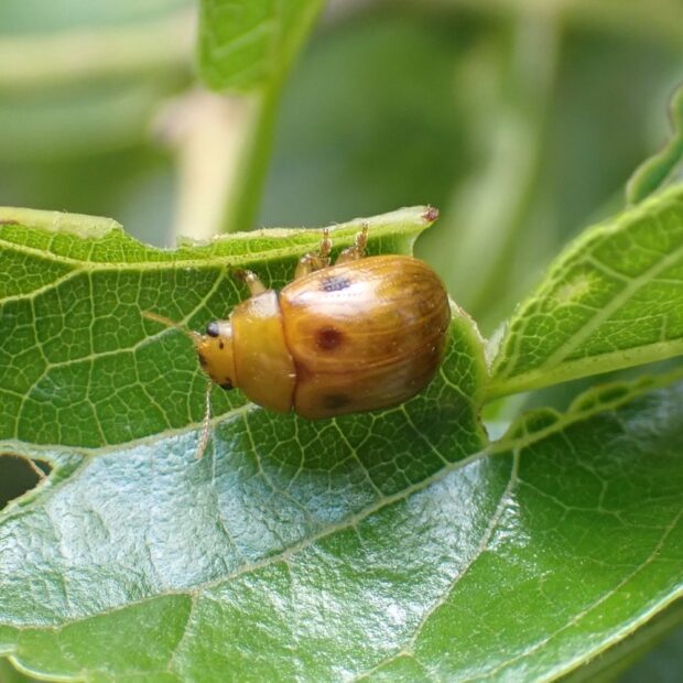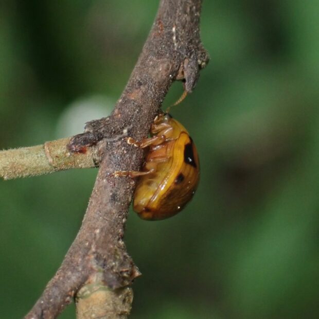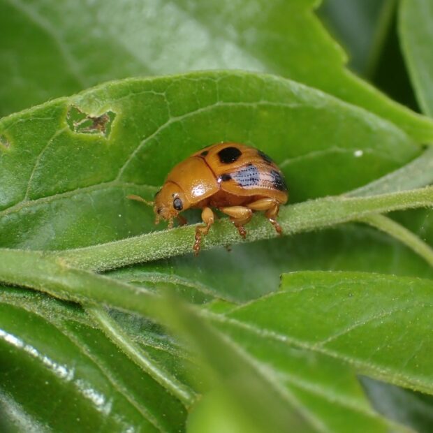 エノキの葉を食べるオレンジ色の体に八つの黒い紋があるハムシ。 紋がないものや全体が黒色になるものまで見られ、 色や模様に変異があります。