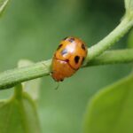 エノキの葉を食べるオレンジ色の体に八つの黒い紋があるハムシ。 紋がないものや全体が黒色になるものまで見られ、 色や模様に変異があります。