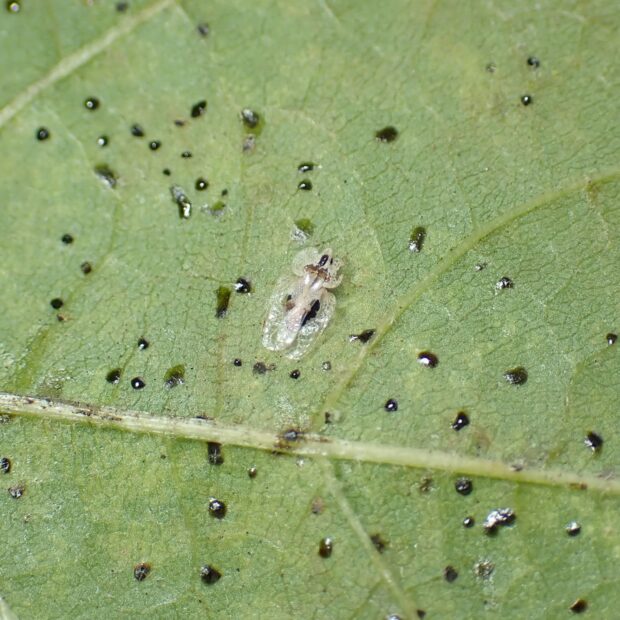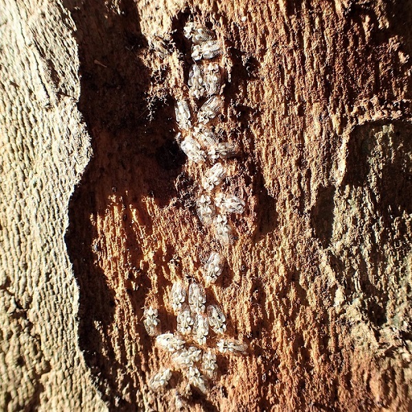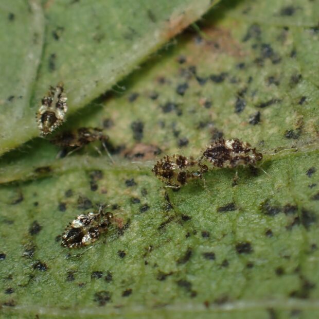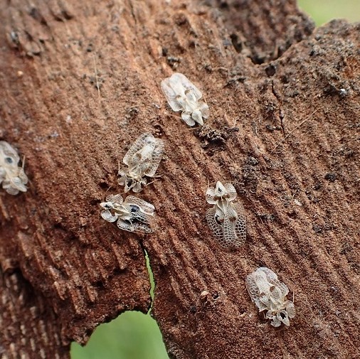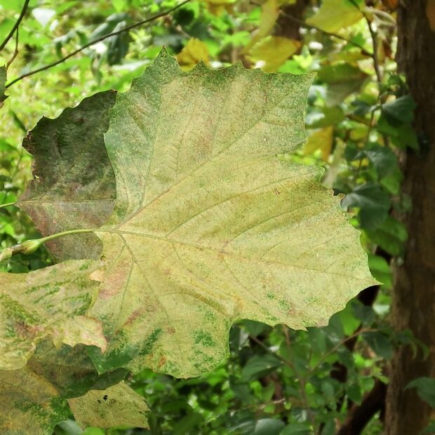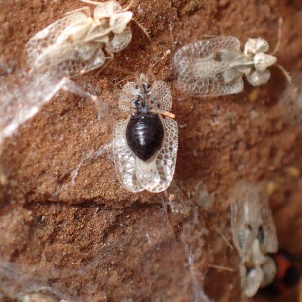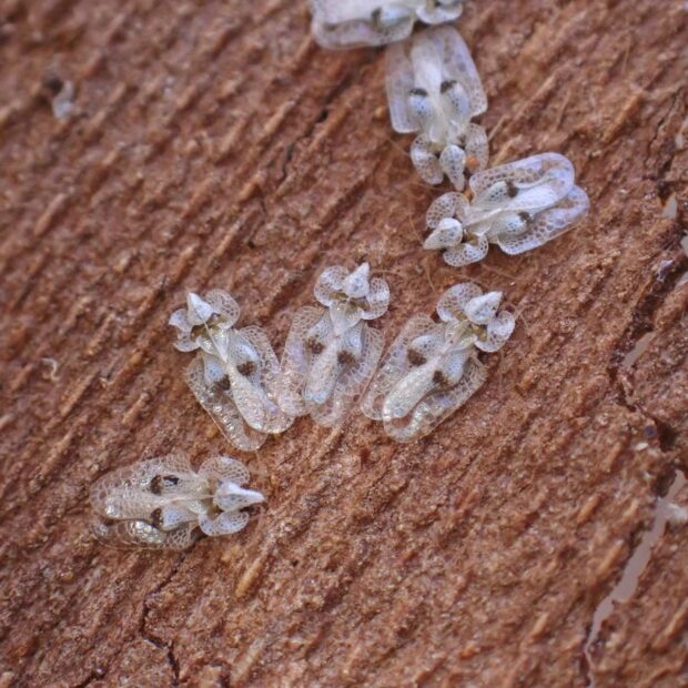 北米原産の外国産グンバイムシ。 グンバイムシがプラタナスの葉の汁を吸うことにより、 葉は白くなります。 プラタナスの樹皮の下などで成虫越冬します。 2001年に名古屋で発見され、 各地に広がっています。