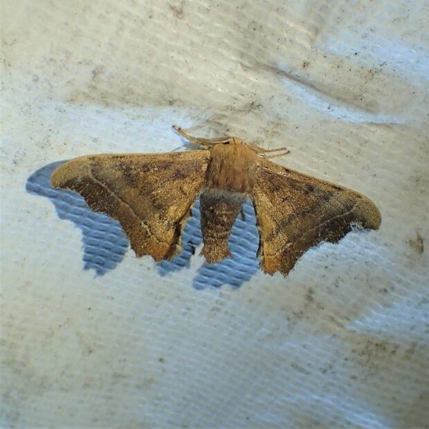カイコガの仲間。 カイコの原種と言われるクワコに似ていますが、 はねの縁がギザギザになっています。 幼虫はクワではなくカエデの葉を食べます。