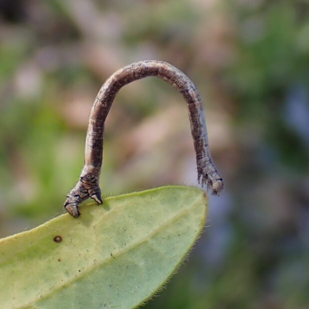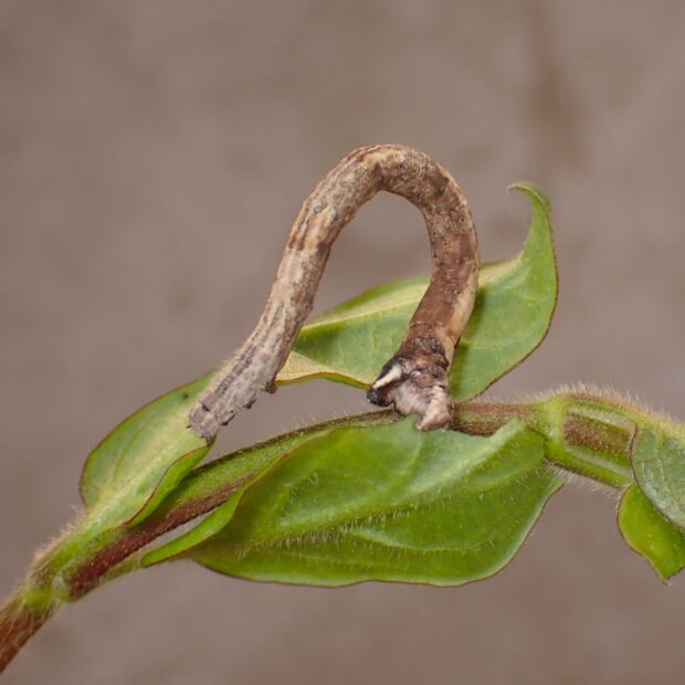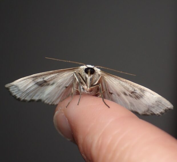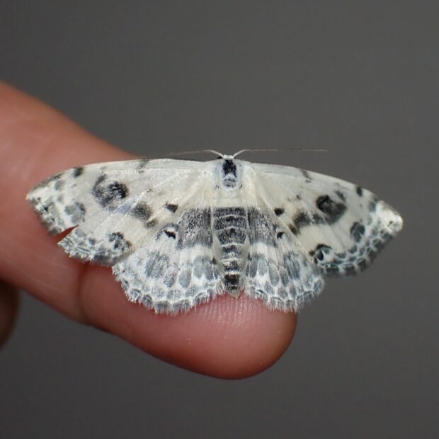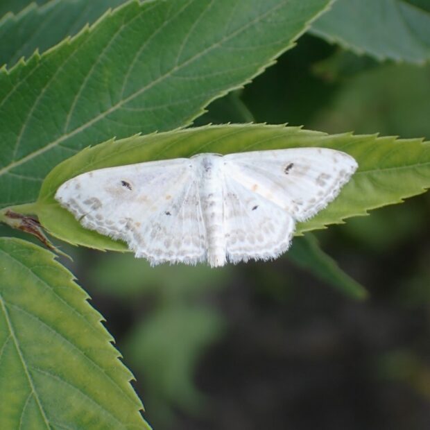 白っぽいはねに、 グレーや黒の模様があるヒメシャクの仲間。 はねにモヤモヤした模様があることから「雲紋(ウンモン)」と名づけられたようです。 市街地でも見られます。