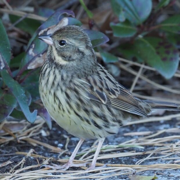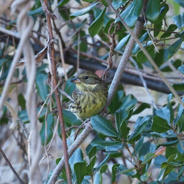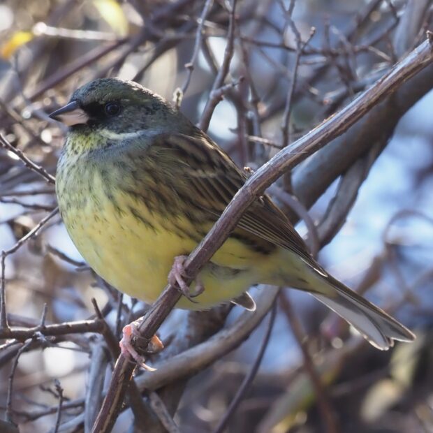 薄暗い茂みや林の中で小群を作って生活し、 「チッ、 チッ」と鳴きながら動きます。 オスの夏羽は、 目の周りとくちばしの間が黒くなります。