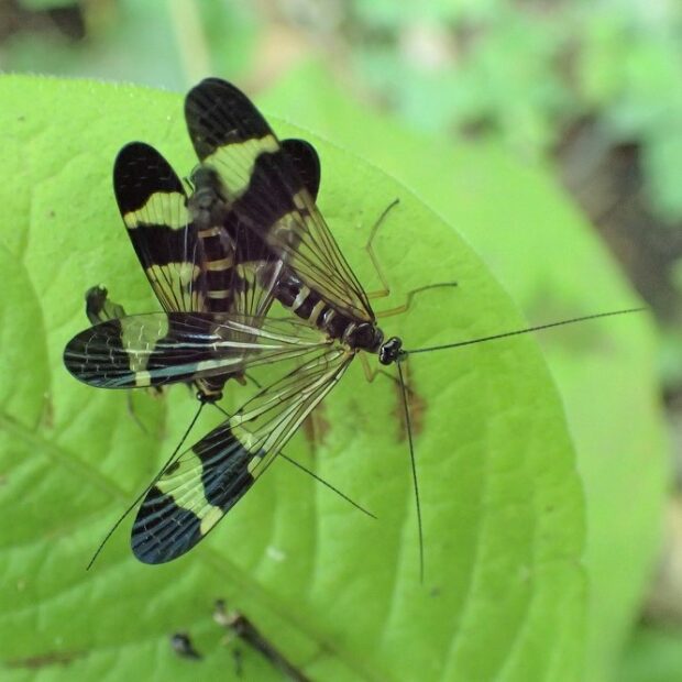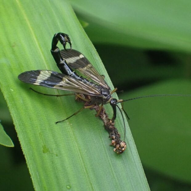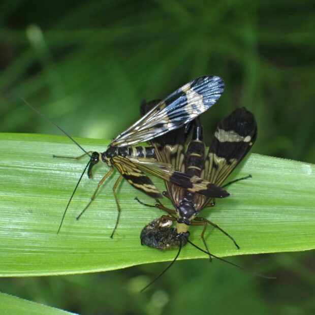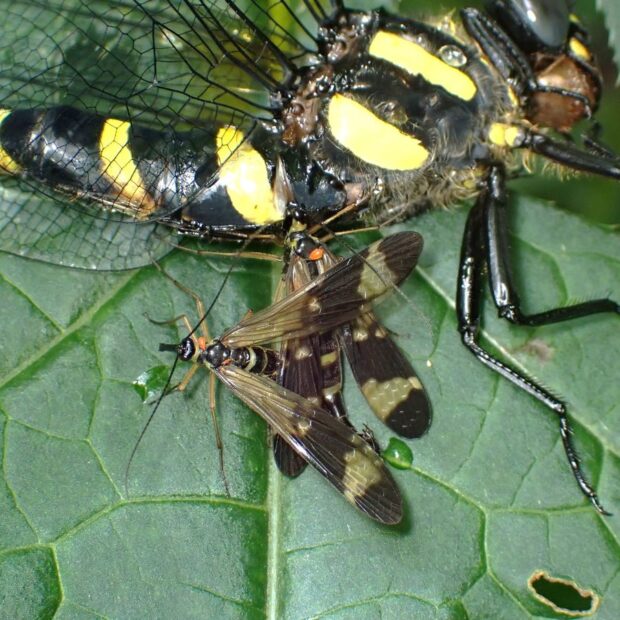 メスがオニヤンマの死骸を食べている間に、 オスは交尾をする。