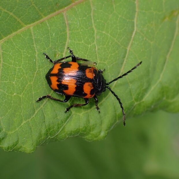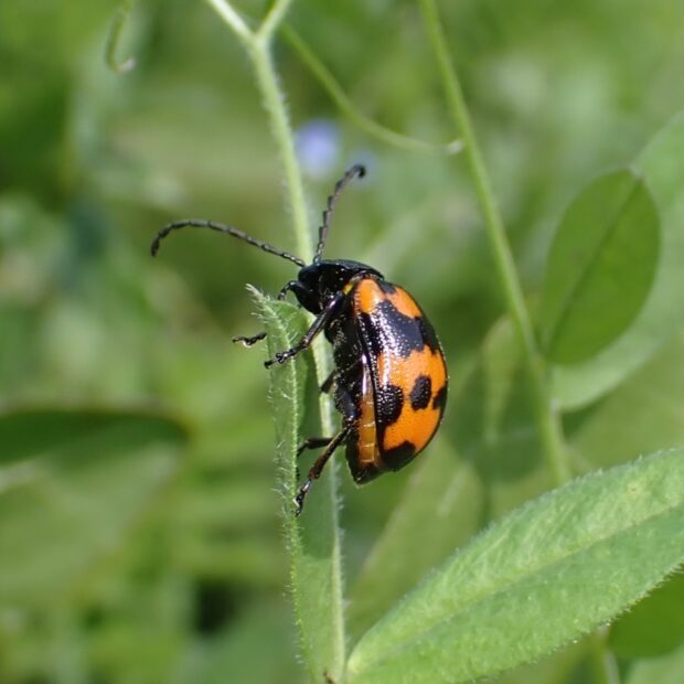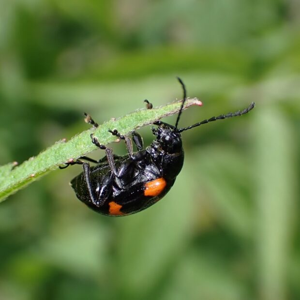 テントウムシ?いいえ、 立派な触角を持ったハムシです。 黒いはねに赤い紋が目立ちますが、 色や模様は変異がありさまざまです。 草地などで、 タデ科のイタドリ、 ギシギシ、 スイバなどの葉を食べます。 4月頃、 冬を越した成虫をよく見かけます。