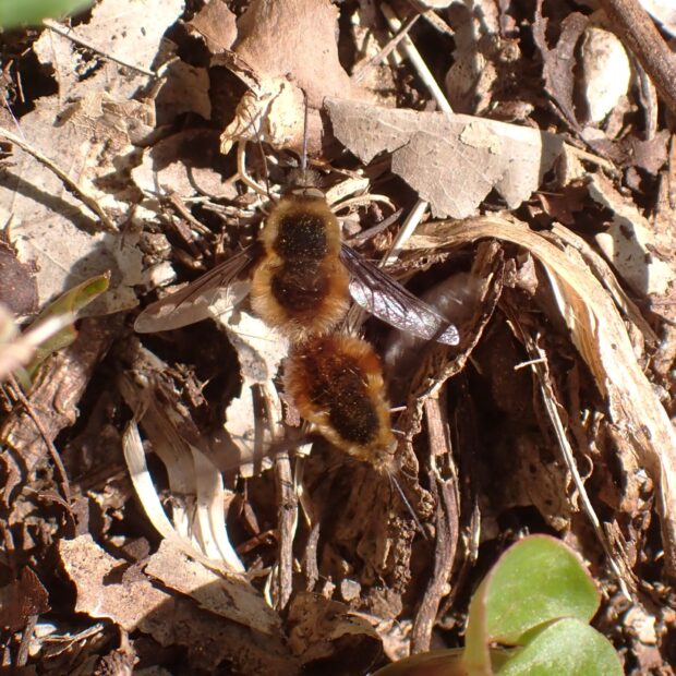 春にだけあらわれる、 長い毛がある丸っこい体のツリアブ。 ホバリングしながら花から花へ、 長い口吻(こうふん=細長く伸びた口の器官)を伸ばし、 花の蜜を吸います。 ヒメハナバチ類の幼虫や蛹に寄生します。