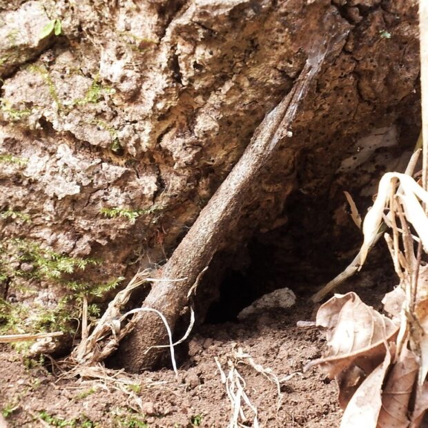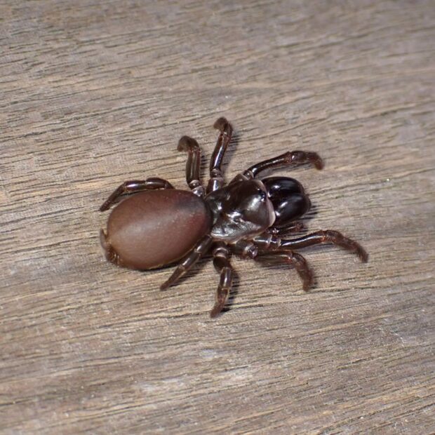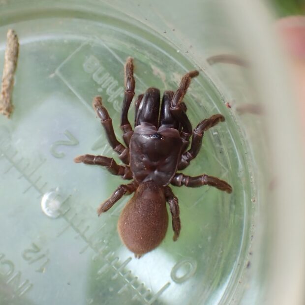 ジグモの仲間。 地中にすむ原始的なクモで、 木の根元や塀などに袋状の住みかをつくります。 振動に敏感で、 獲物が近づくと、 クモはその位置まで上がってきて、 袋越しにかみつき、 袋を破って中に引き込みます。 成体になるまで3年以上かかります。
