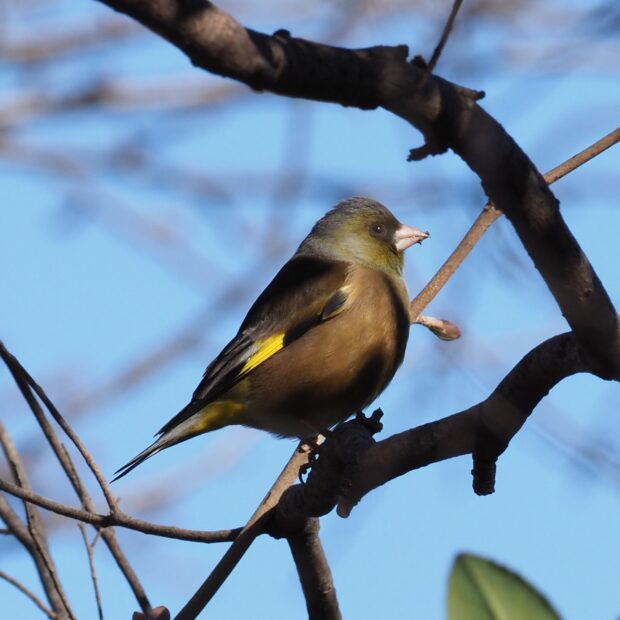 「キリリリ」と特徴的な声で鳴きます。 飛んだときに黄色い模様が目立ち、 飛んでいる姿でも他の鳥と見分けることができます。 樹木の上だけでなく、 地上でも採食し、 普段は木や草の種子を食べます。
