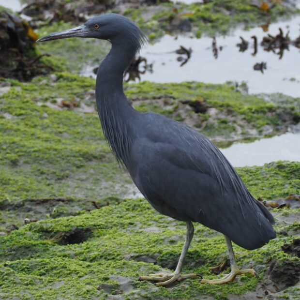 磯で採食を行い、 普段は一羽かつがいで行動します。 多くの個体が黒色ですが、 白い体色をした個体もいます。 脚の色は黄色のものが多く、 足先は黄色です。