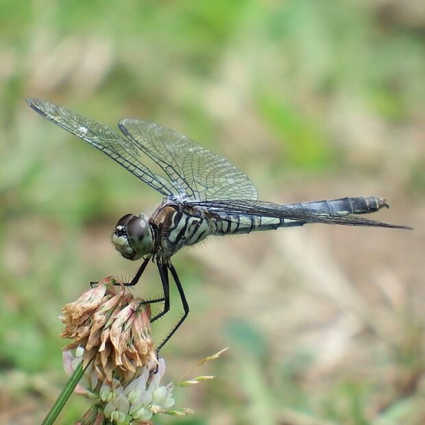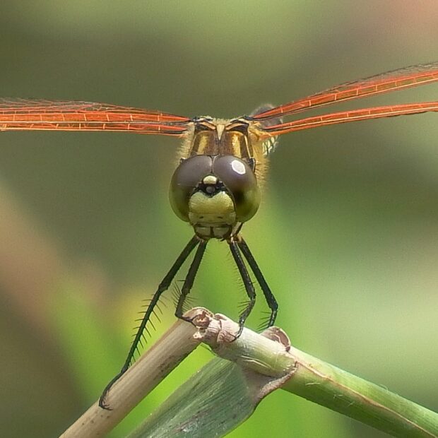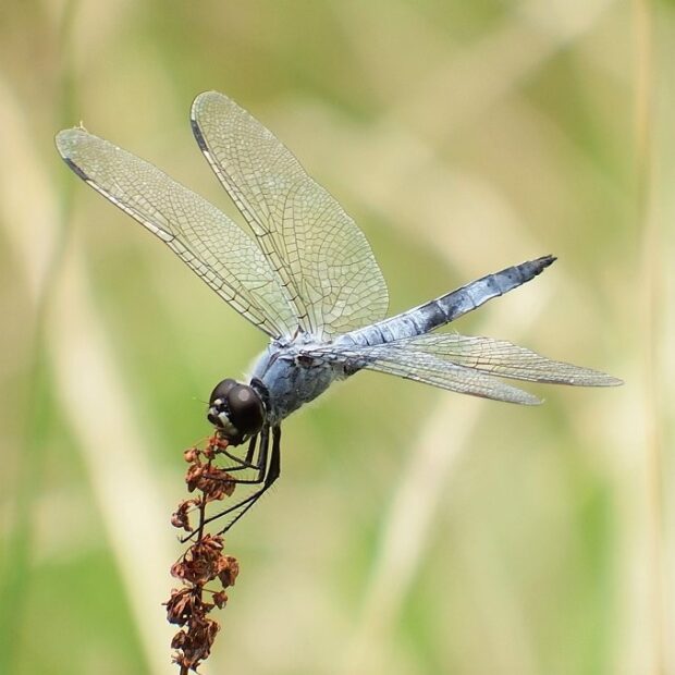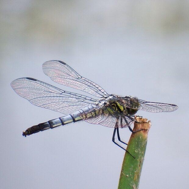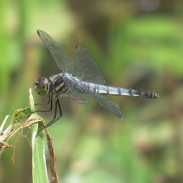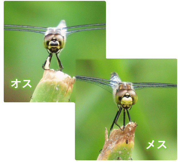 ヨシなどの植物がある池で見られるトンボ科の仲間。 成熟するとオス、 メスともに白い粉をまとうことから、 「粉吹き(こふき)」の名前がついています。 メスは「オビトンボ型」と呼ばれる、 粉をふかず、 はねに茶褐色の帯があるタイプが見られます。