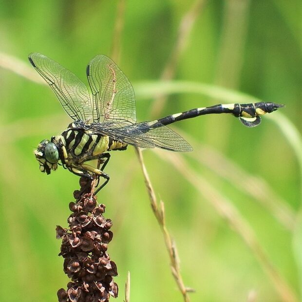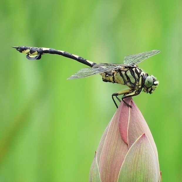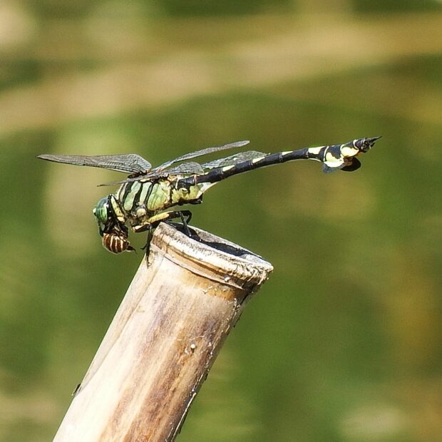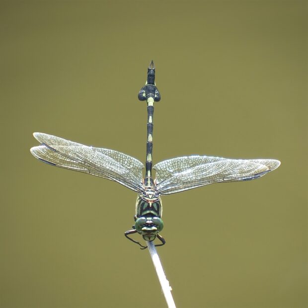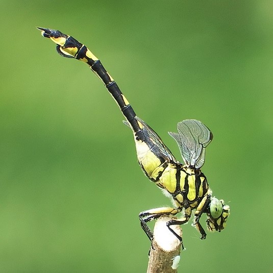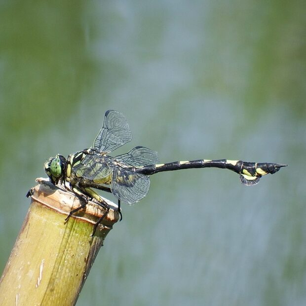 サナエトンボの仲間。 腹部の先端近くに、 オスもメスも、 うちわ状の突起を持ち、 はねを広げて、 杭や植物の先端によくとまります。 ヨシなどの植物がある大きくて水深のある池などで見られます。