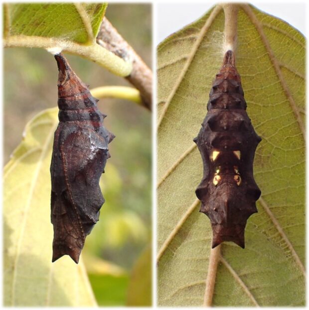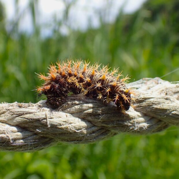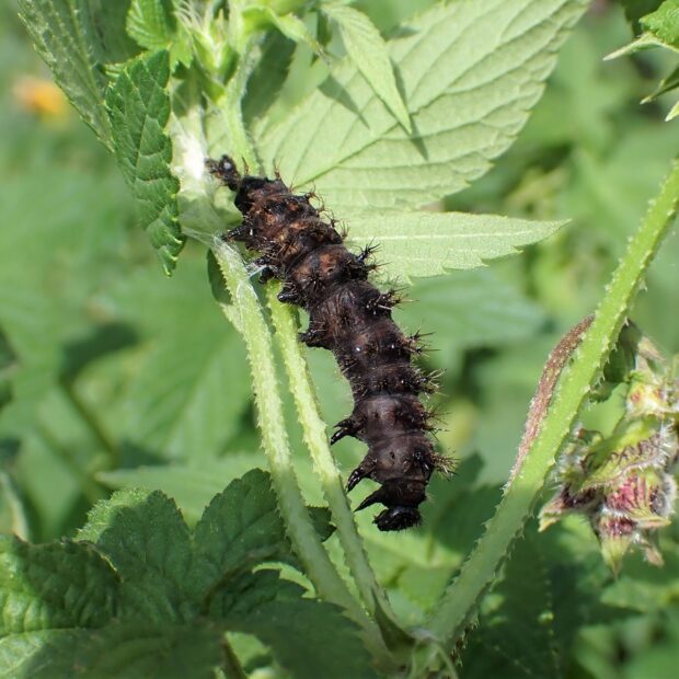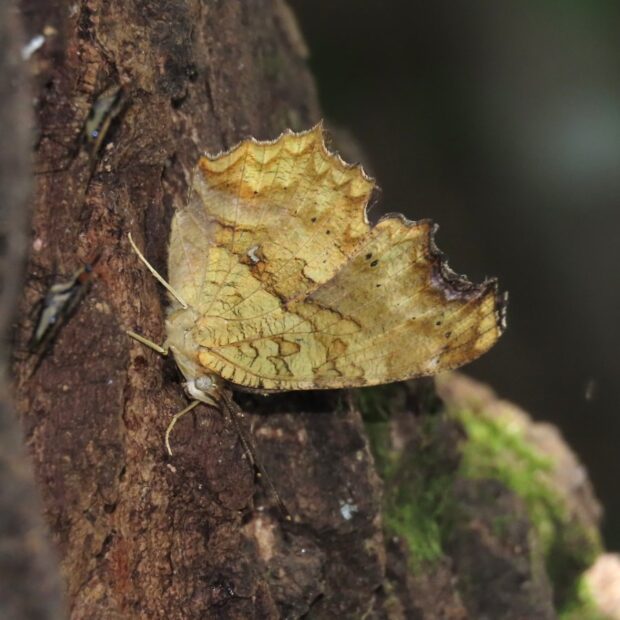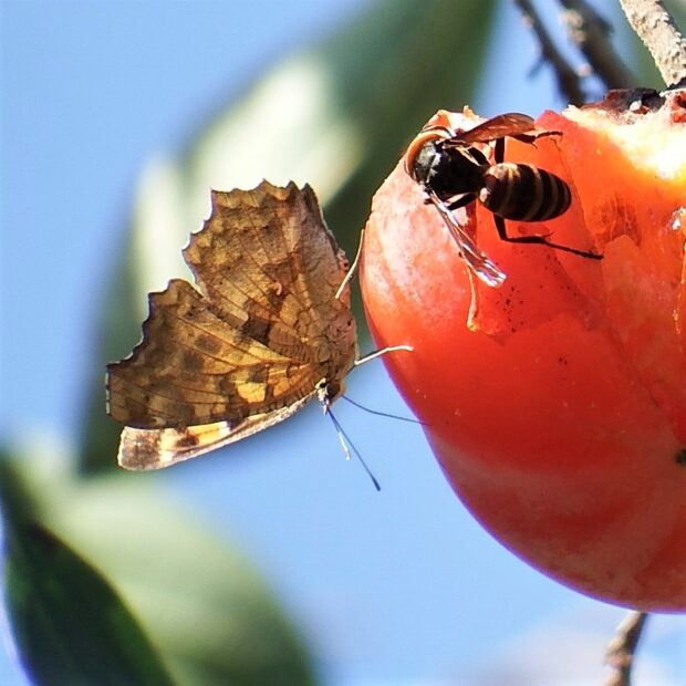 表ばねは黄色地に黒い紋、 はねをたたむと、 枯れ葉のような保護色になるタテハチョウ。 カナムグラが生える明るい草地や公園などで、 普通に見られます。 花を訪れるほか、 樹液や熟れた果実にもやって来ます。 秋型はオレンジ色で、 はねのへりの切れ込みが深くなります。
