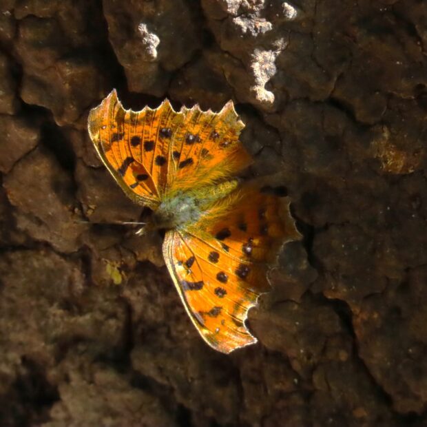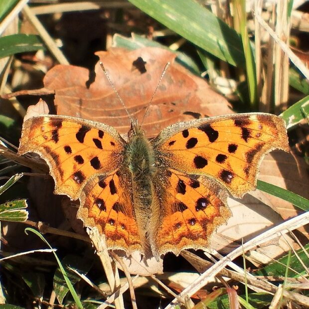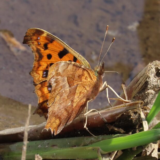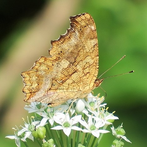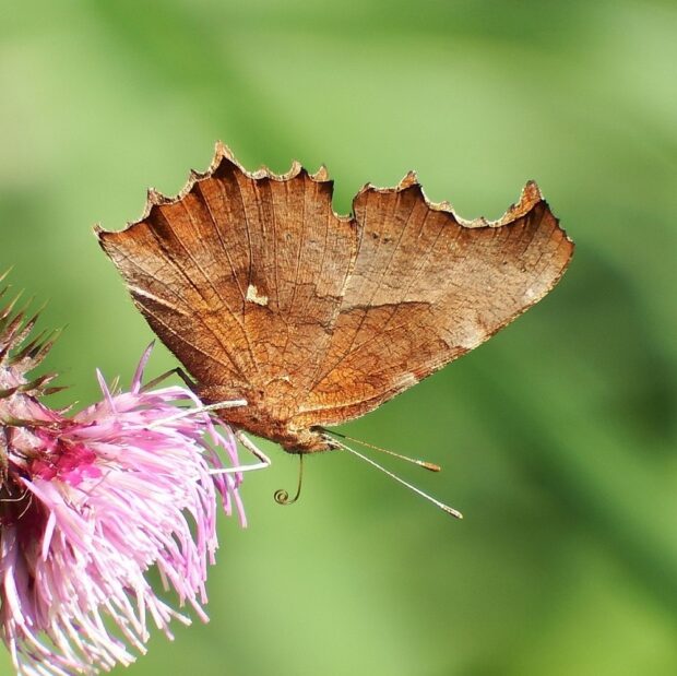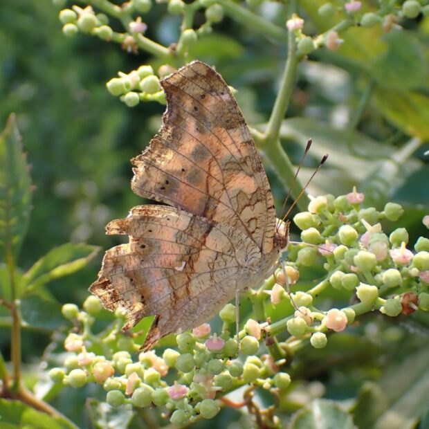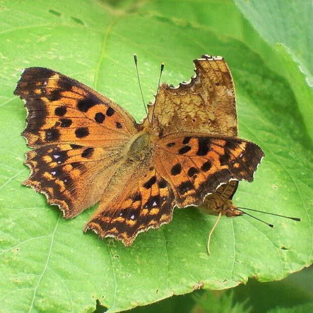 キタテハは、 平地~低山地のカナムグラが生える草地で見られます。 北海道では少ないです。