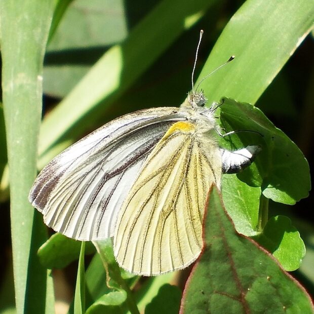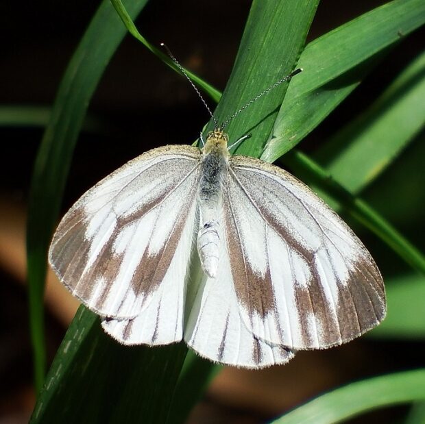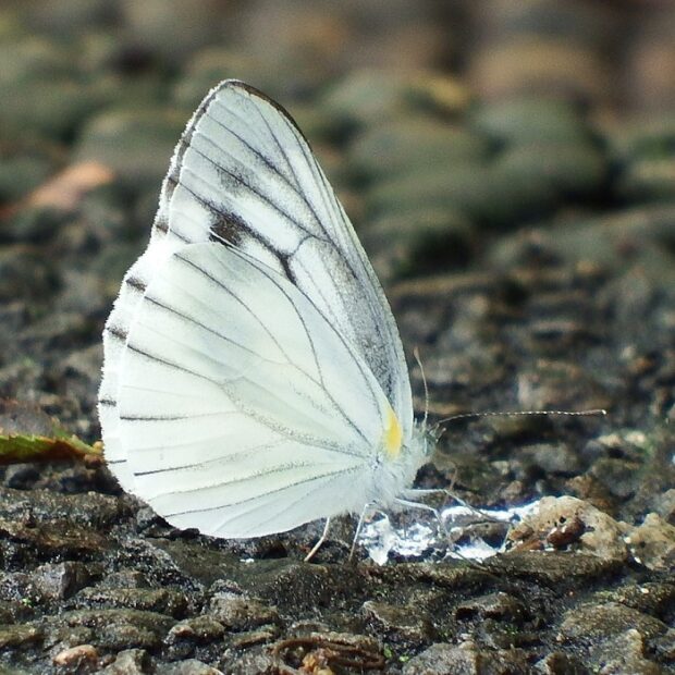 スジグロシロチョウは、 やや薄暗い環境を好み、 はねの翅脈(しみゃく=すじのこと)が黒いです。