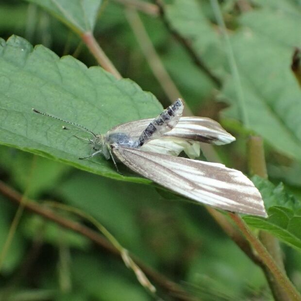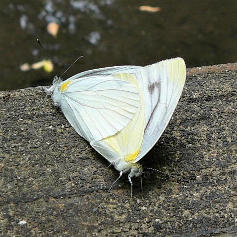 モンシロチョウと似ていますが、 はねに黒いすじがあり、 ややうす暗い環境を好みます。 人家周辺で普通に見られます。 オスをつかまえてかいでみると、 レモンのような匂いがします。