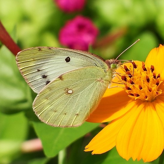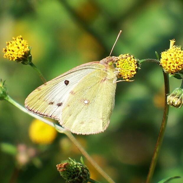草地、 公園、 川の堤防など明るく開けた環境で見られる黄色いチョウ。 早春からあらわれ、 晩秋まで見られます。 オスのはねは黄色、 メスは黄色と白色の2つのタイプがあります。