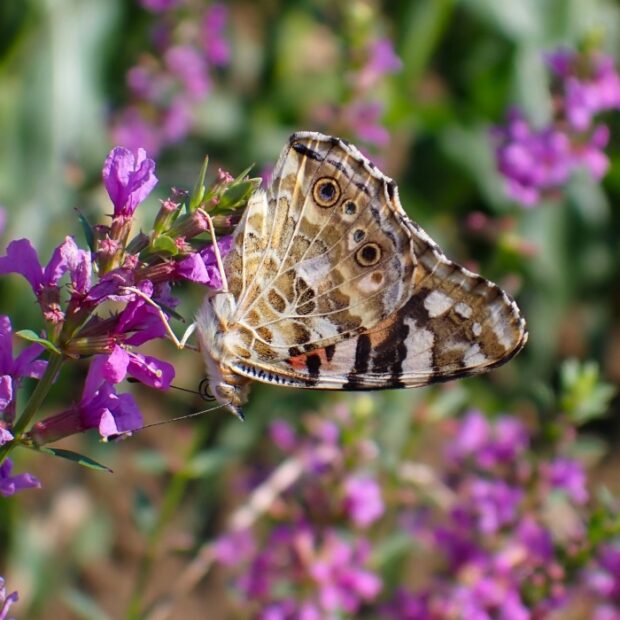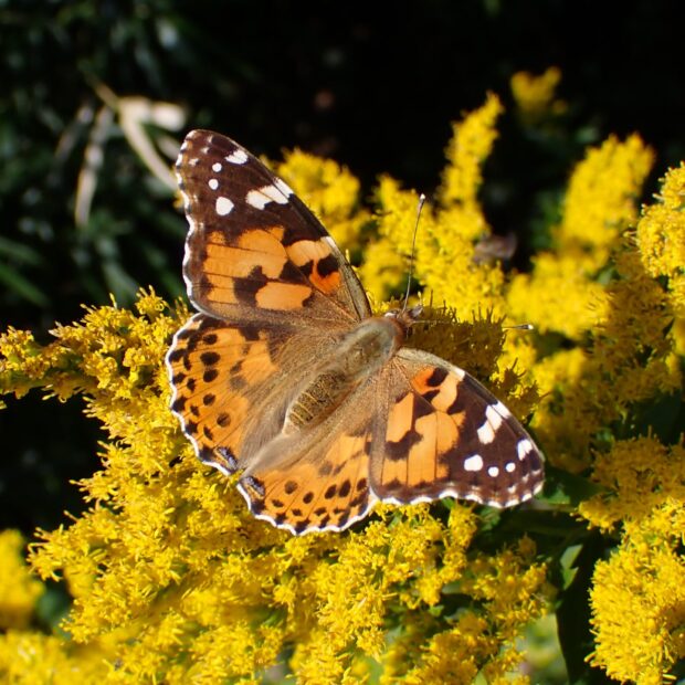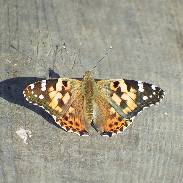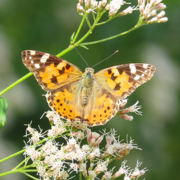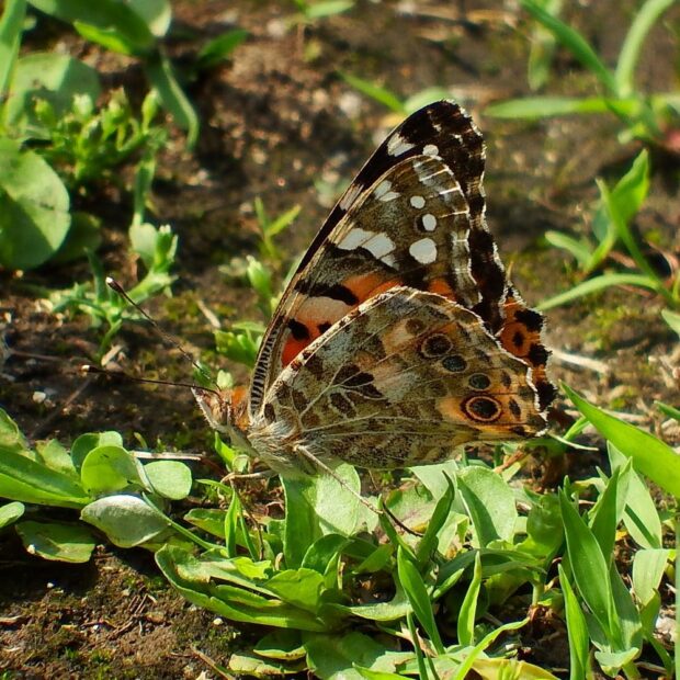 オレンジ色に黒い紋があるタテハチョウ。 草地、 公園、 畑など開けた明るいところで普通に見られ、 花によくやって来ます。 夏から秋にかけて分布を広げ、 数を増やします。