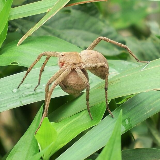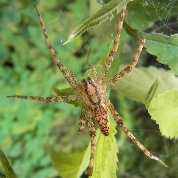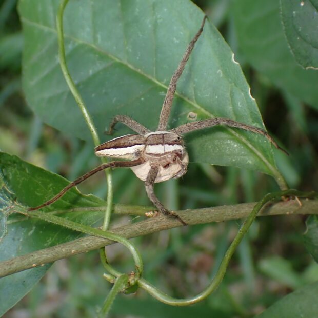 あしの長い大きなクモ。 黄色や褐色のもの、 白い帯があるもの、 まだら模様があるものなど、 色や模様はさまざまです。 水田の周辺、 草地などの草や木で見られます。 網を張らずに、 待ち伏せをして獲物をとらえます。