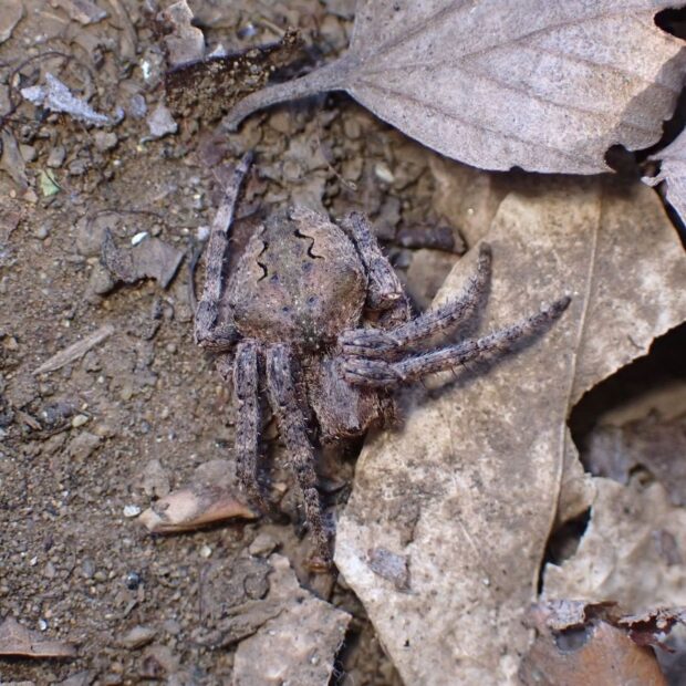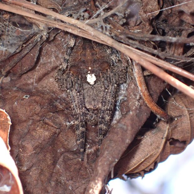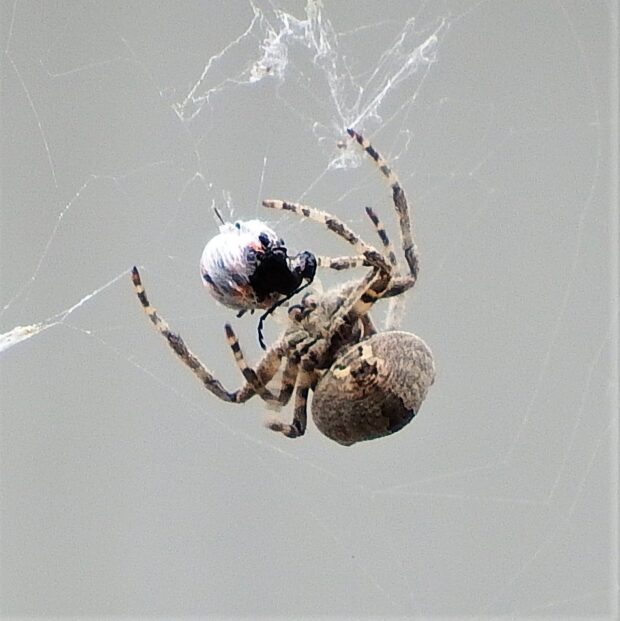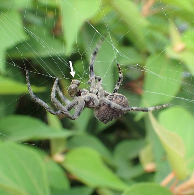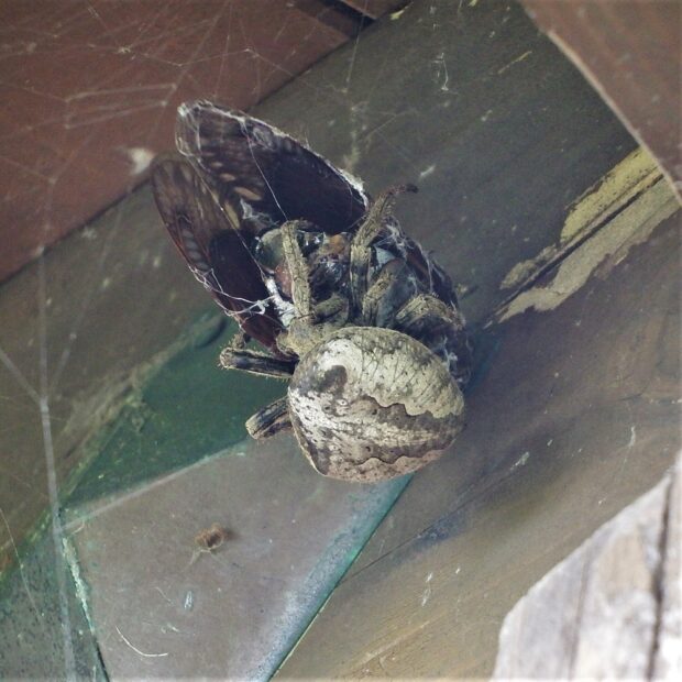 大きな円網をはるコガネグモの仲間。 家の周りで見られる茶色っぽい大きなクモ。 日中は物陰に隠れており、 夕方になると網をはり活動を始めますが、 昼間でも網を張っていることがあります。